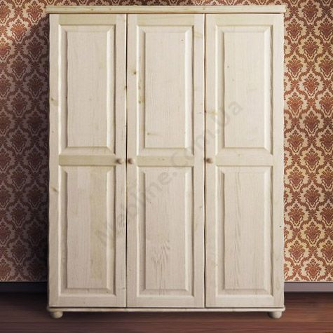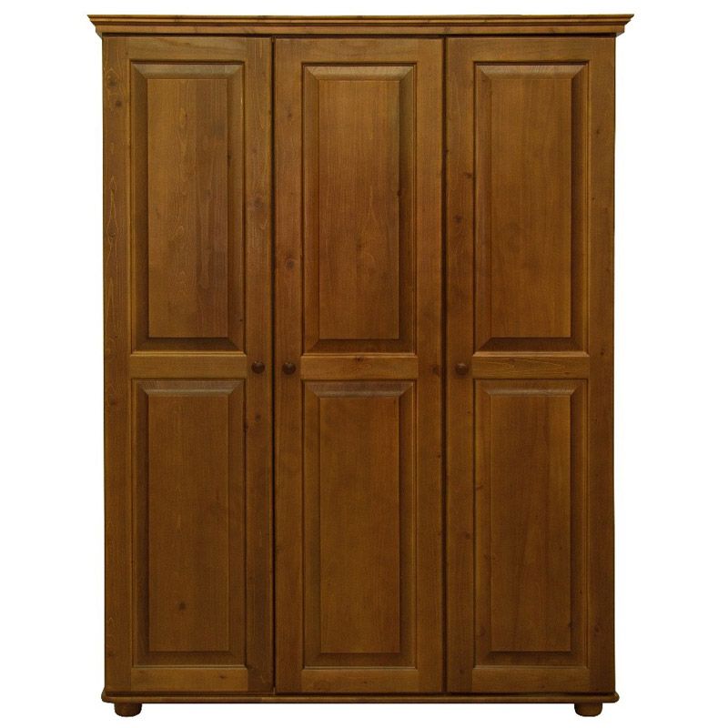 Тридверна дерев’яна шафа зі штангою для одягу та поличками.