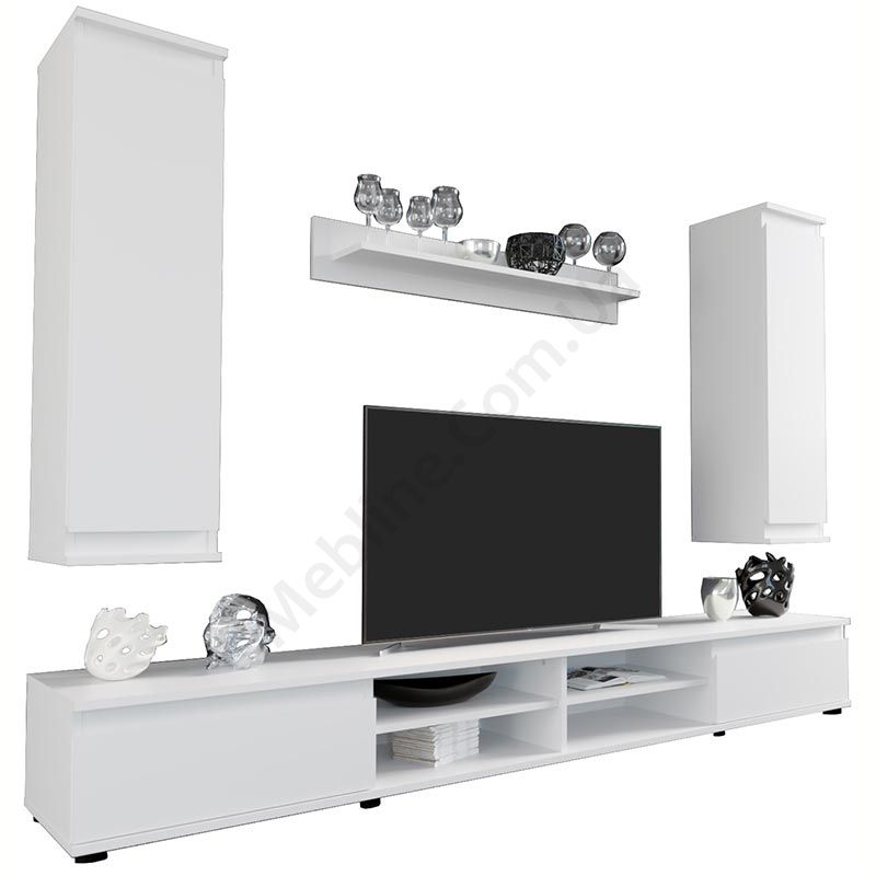 - Тумба під телевізор з двома відкидними дверцятами та чотирма відкритими поличками.
