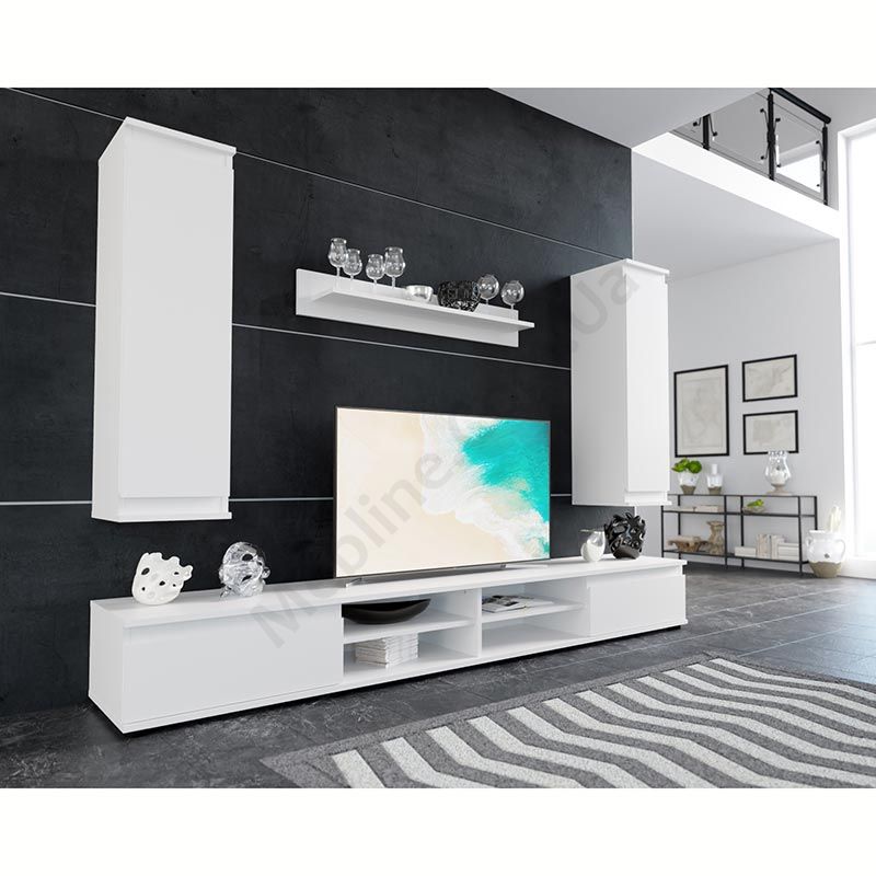 Вітальня з тумбою, пеналами та полицею.