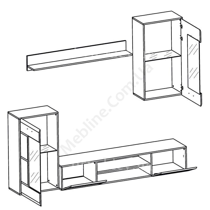 - Тумба під телевізор з двома відкидними дверцятами та відкритими полицями.