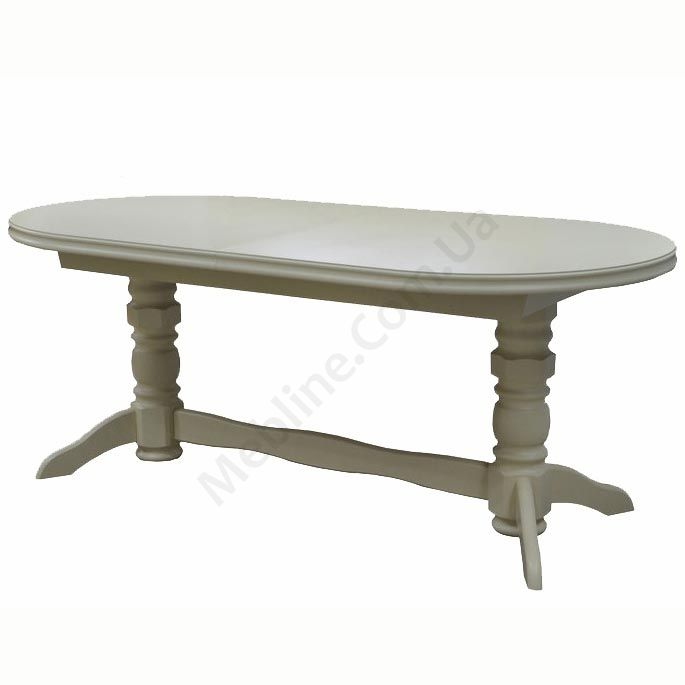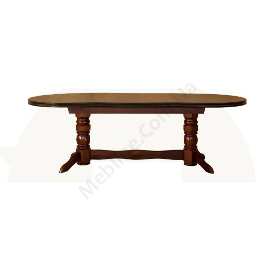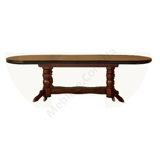 Розкладний обідній стіл овальної форми з натурального дерева на різьблених ніжках.