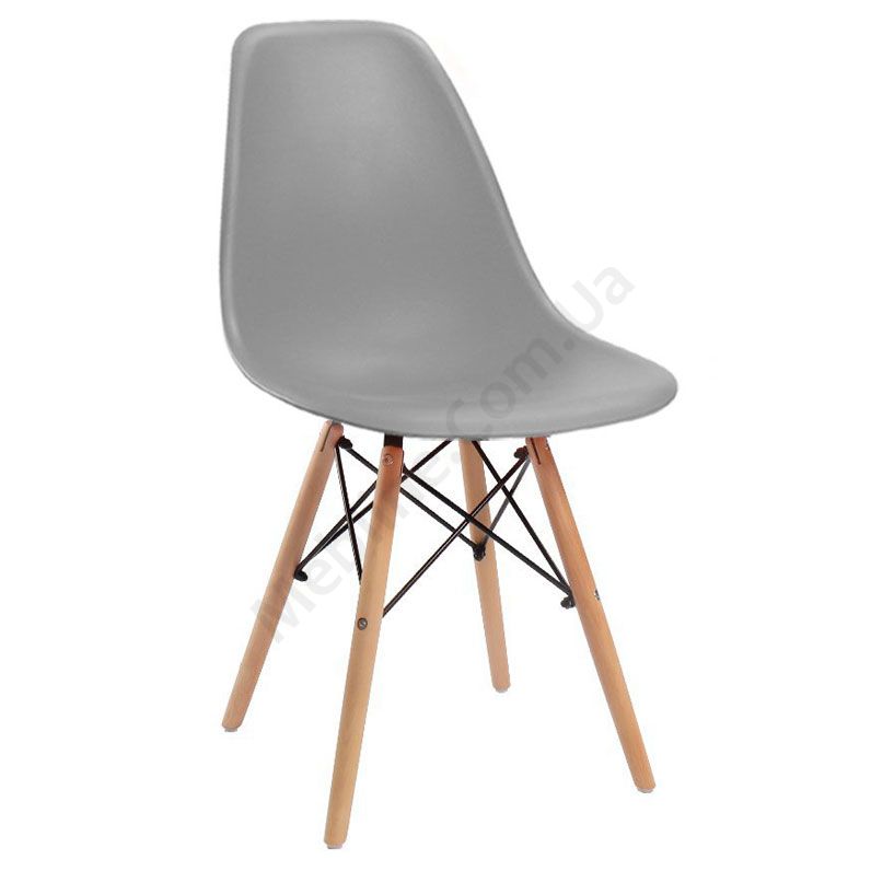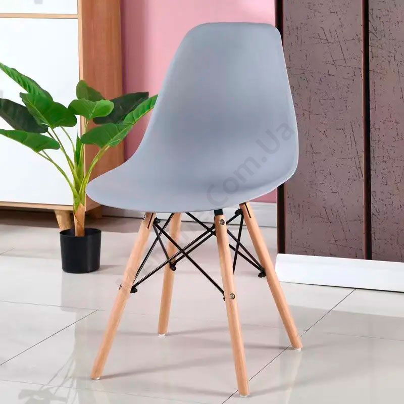 Стілець на дерев’яних ніжках с пластиковим сидінням сірого кольору.