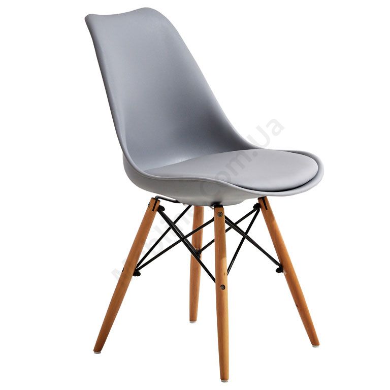 Стілець на дерев’яних ніжках с м’яким сидінням сірого кольору.