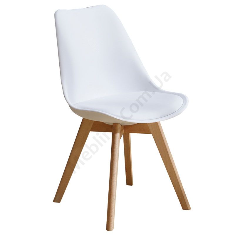 Стілець на дерев’яних ніжках с м’яким сидінням білого кольору.