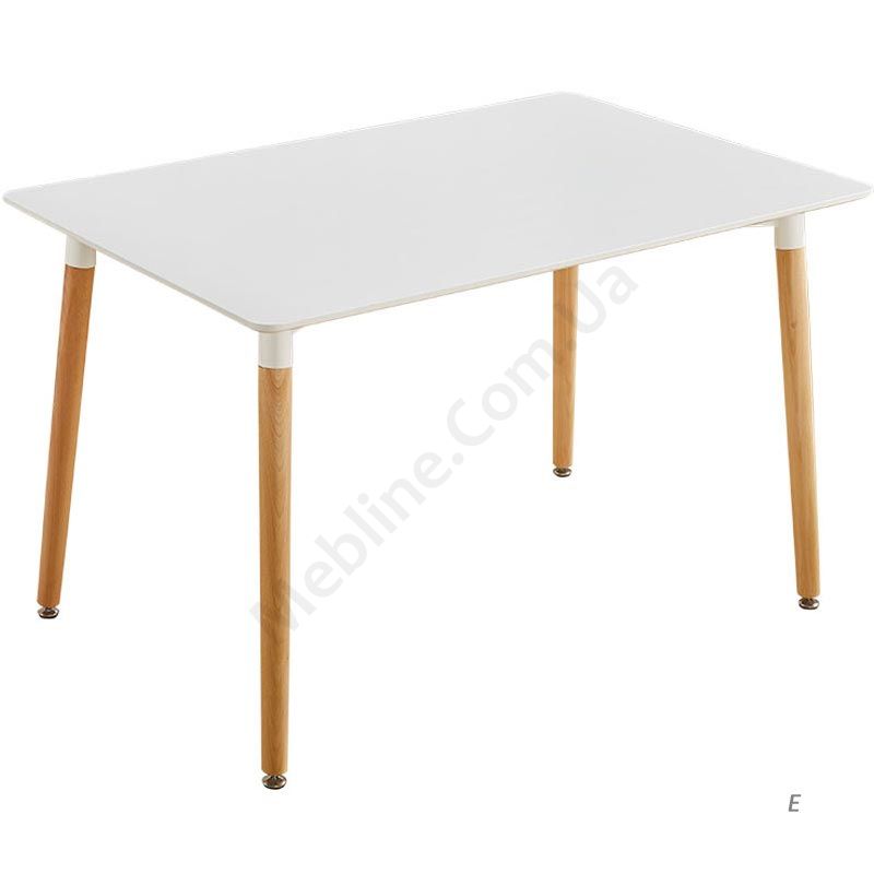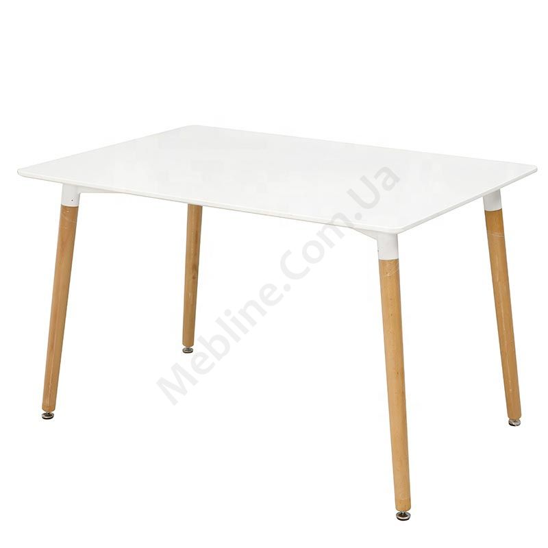 Обідній стіл білого кольору на дерев’яних ніжках.
