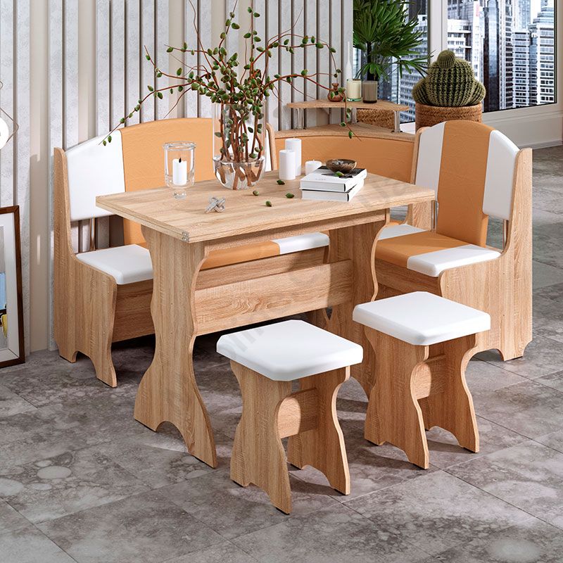 Кухонний куточок з м’якою оббивкою і нішами для зберігання.