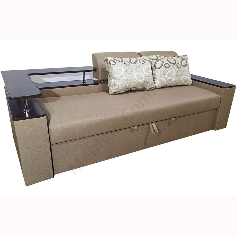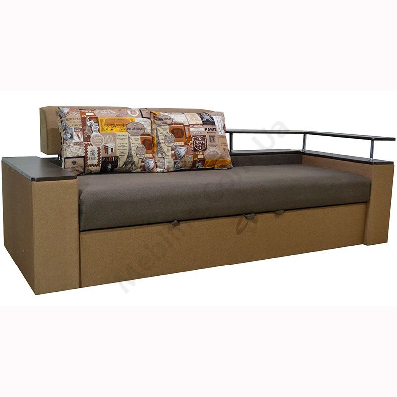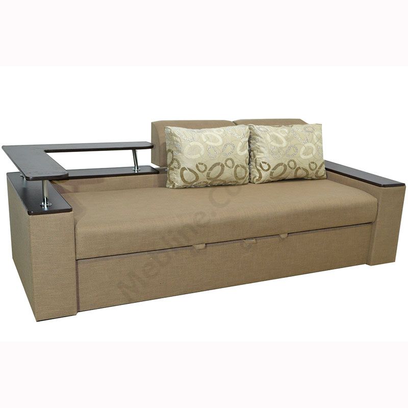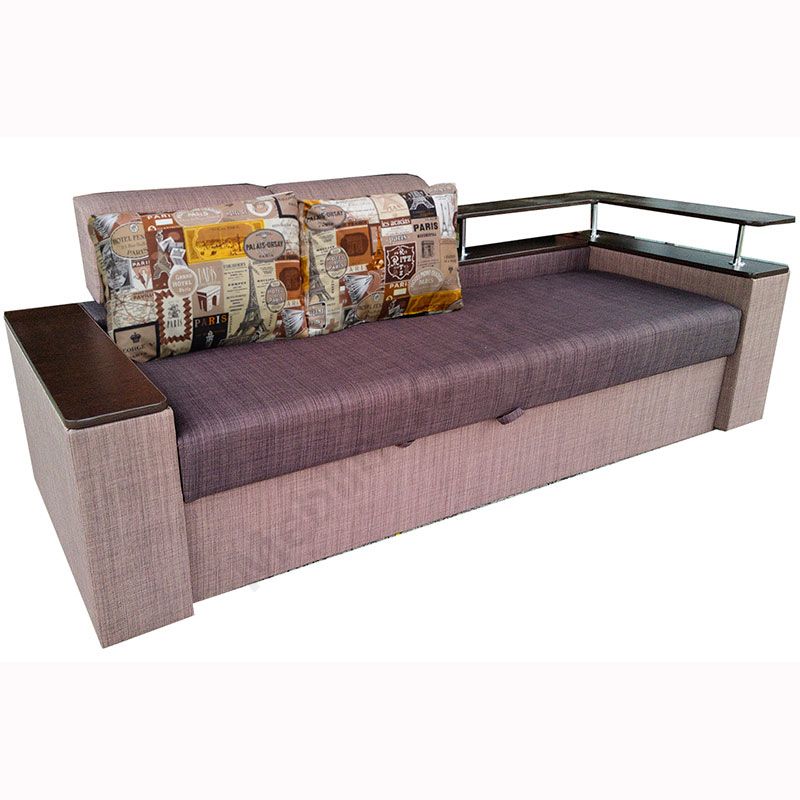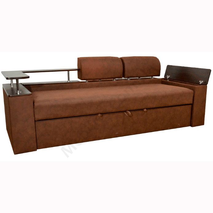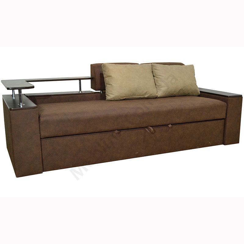 Прямий диван з твердими широкими підлокітниками та поличками.