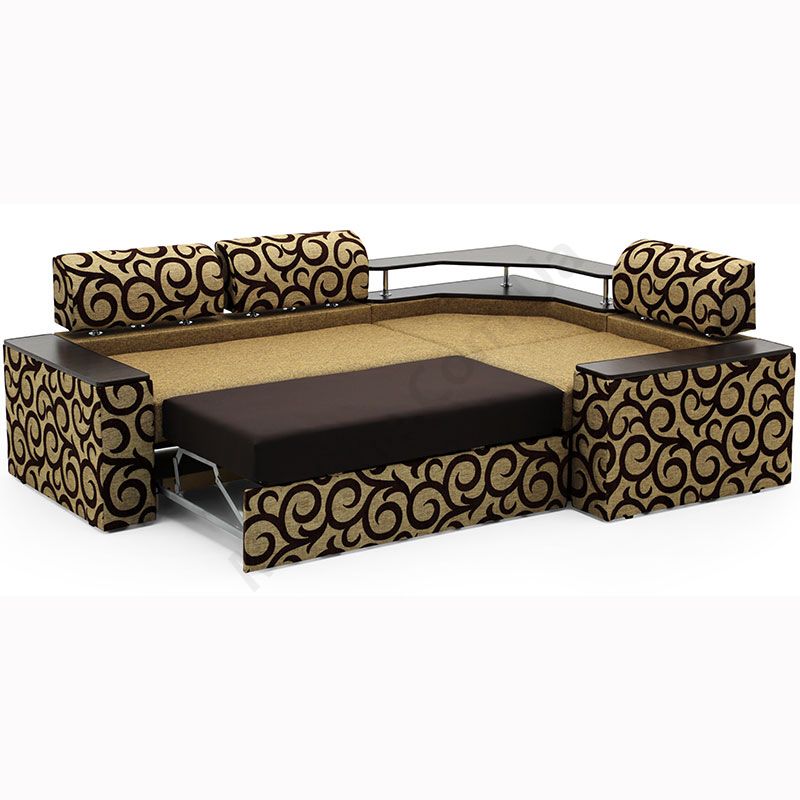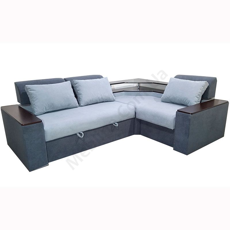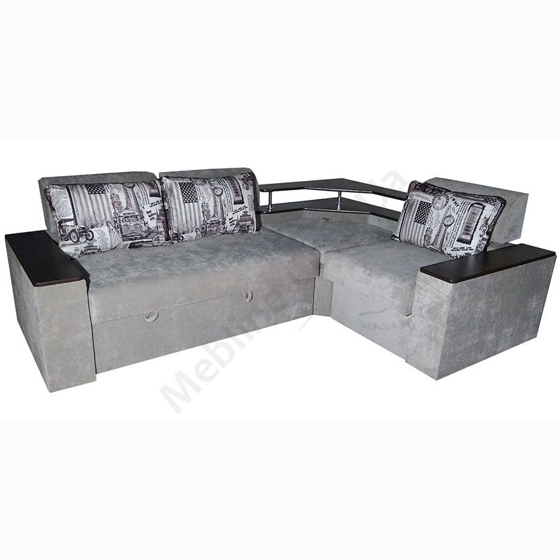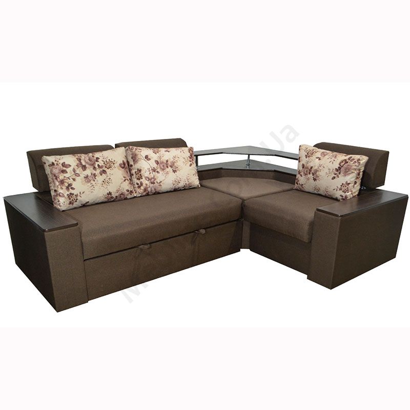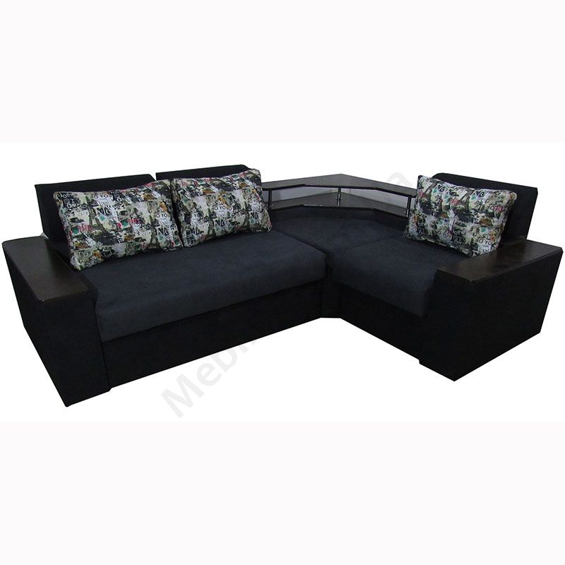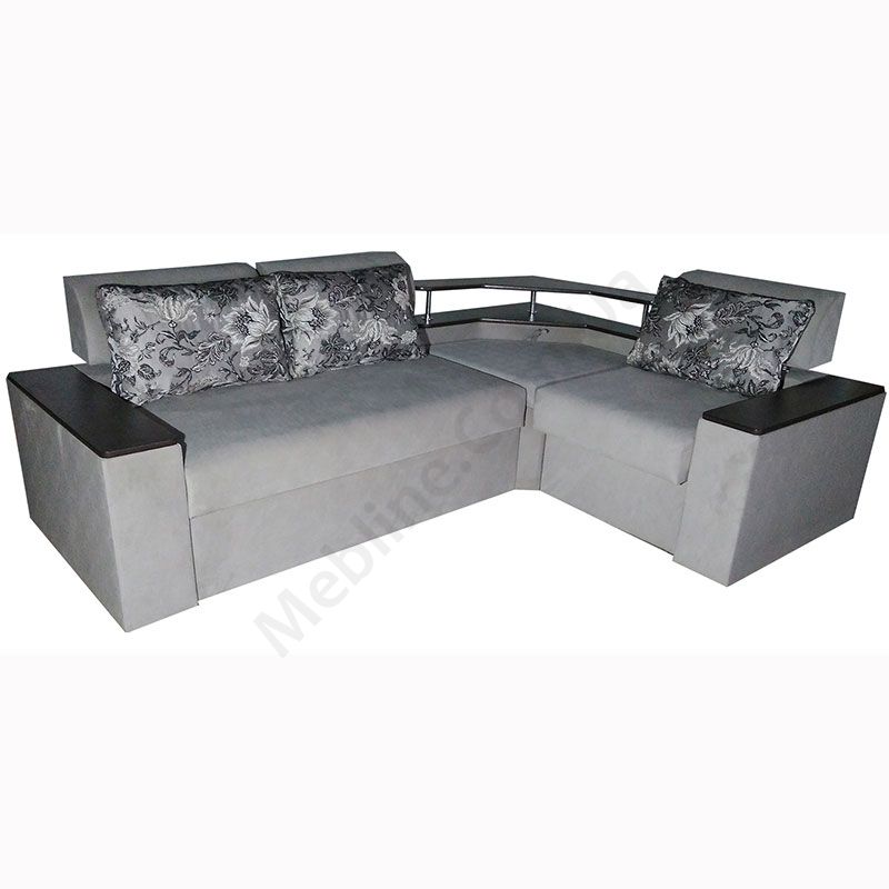 Кутовий диван з твердими широкими підлокітниками та поличками.