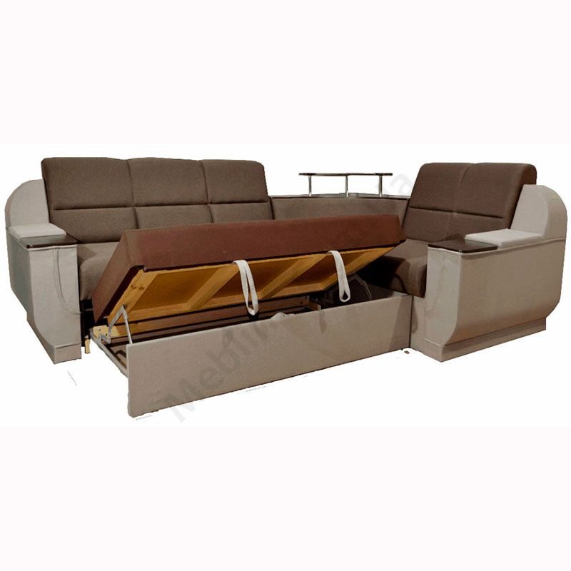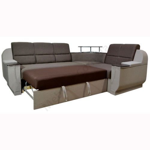 Розкладний кутовий диван з підлокітниками та поличкою.