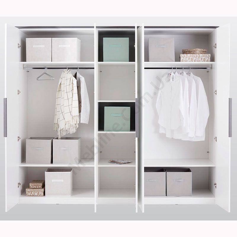 П’ятидверна шафа зі штангами для одягу та поличками.
