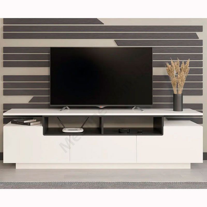 Тумба під телевізор з дверцятами, шухлядою та відкритими секціями.
