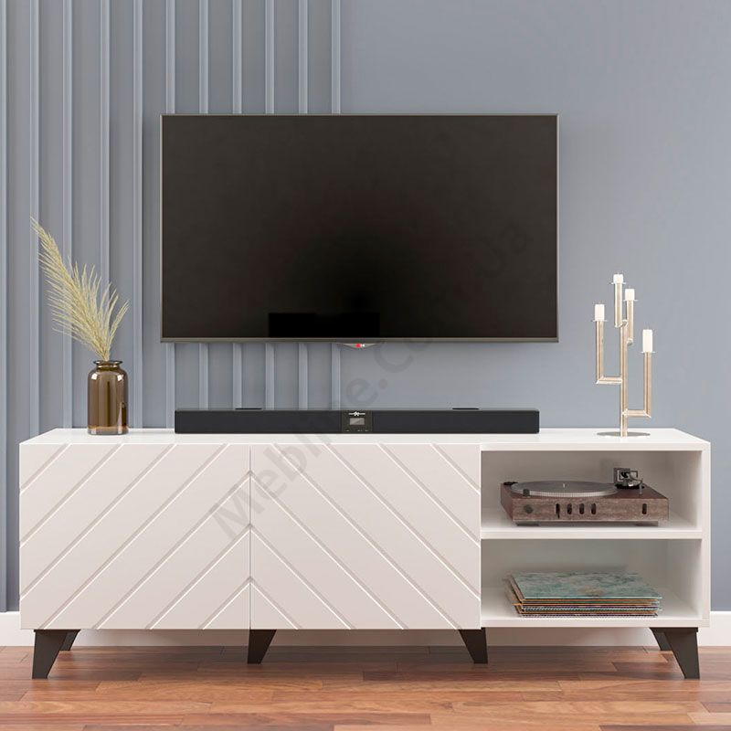 Тумба під телевізор з дверцятами та відкритими секціями.