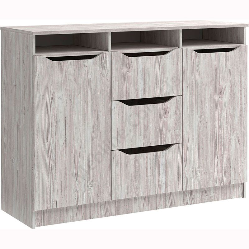 Комод з висувними шухлядами, дверцятами та відкритими полицями.