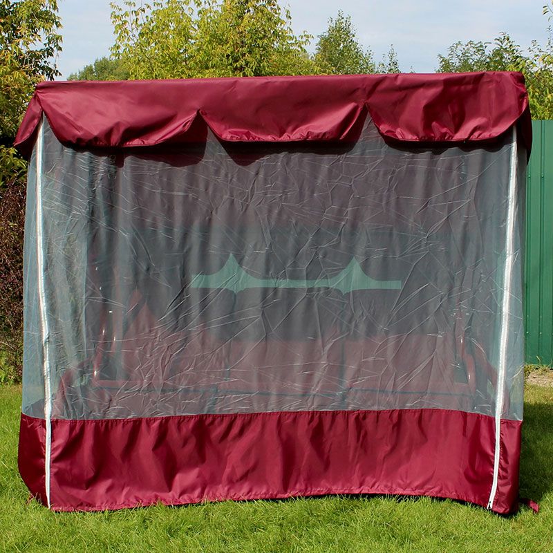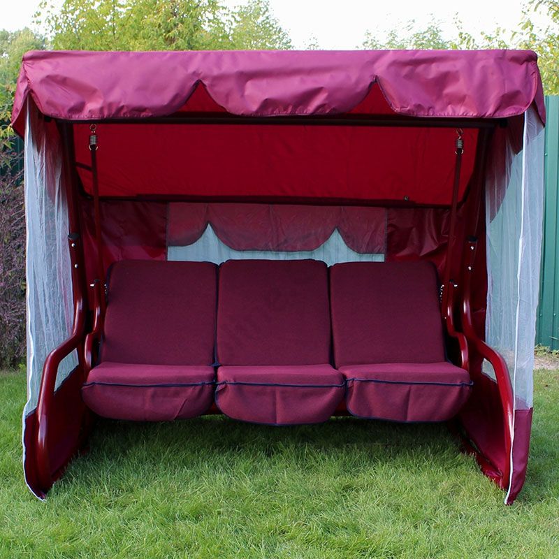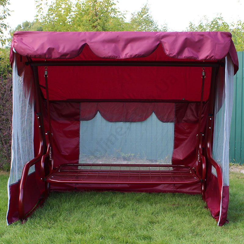 Садова гойдалка з відкидною спинкою та москітною сіткою на бордовому каркасі.