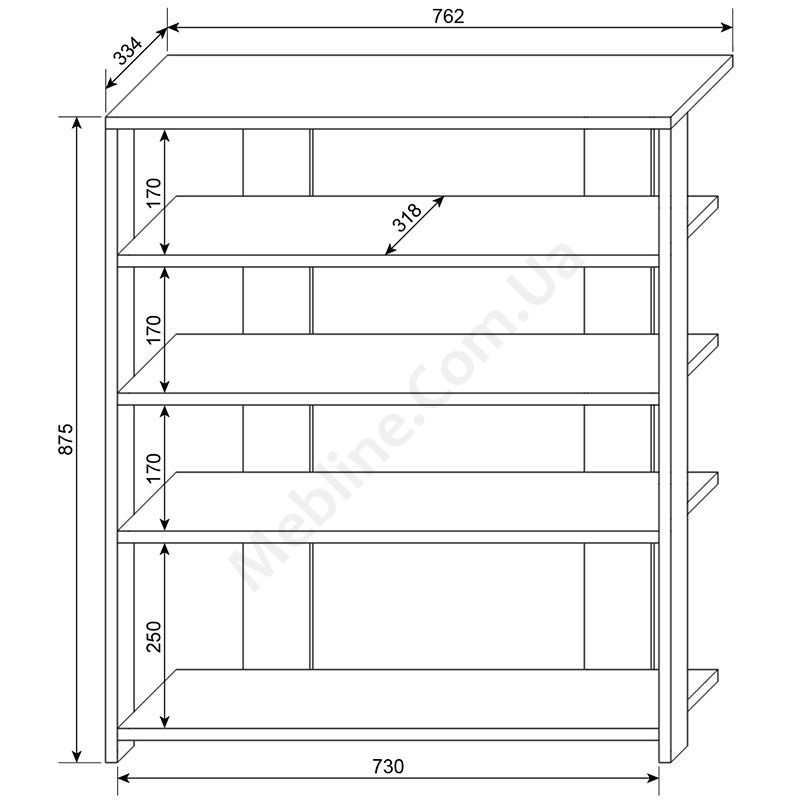 Виконаний з ламінованої ДСП Swiss Krono, завтовшки 16 мм.Екологічна безпека класу Е-1.Кромка — протиударна ПВХ, завтовшки 0,5 мм.Чотири відкриті полиці.