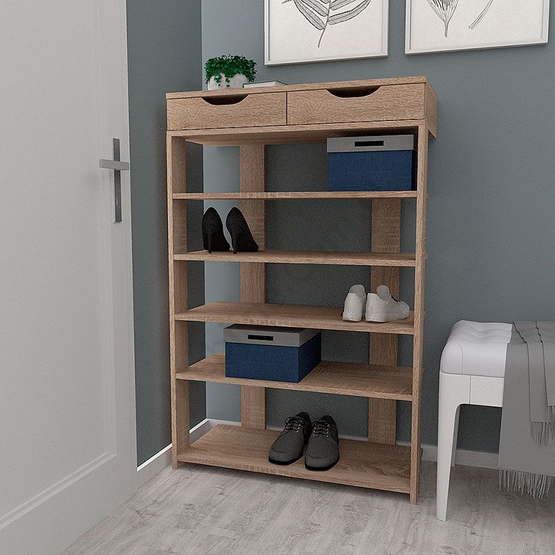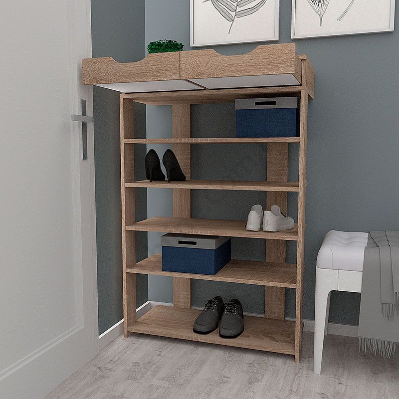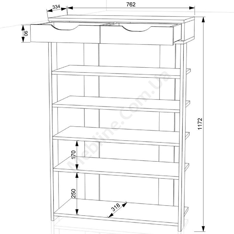 Виконаний з ламінованої ДСП Swiss Krono, завтовшки 16 мм.Екологічна безпека класу Е-1.Кромка — протиударна ПВХ, завтовшки 0,5 мм.П’ять відкритих полиць.Дві висувні шухляди.Шухляди без напрямних.