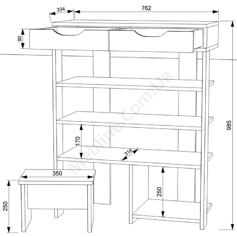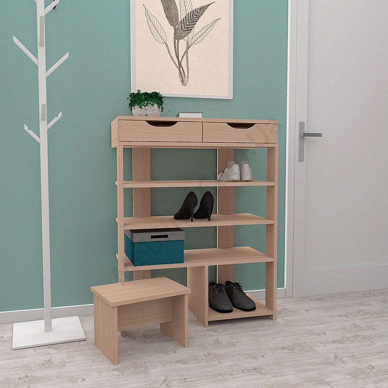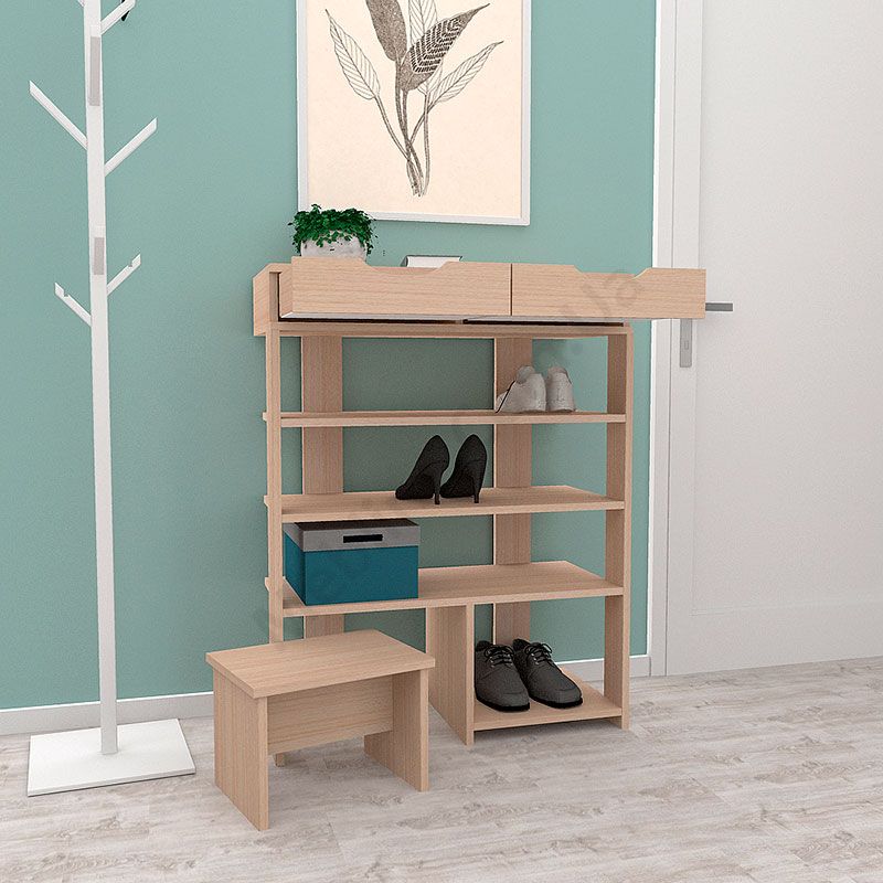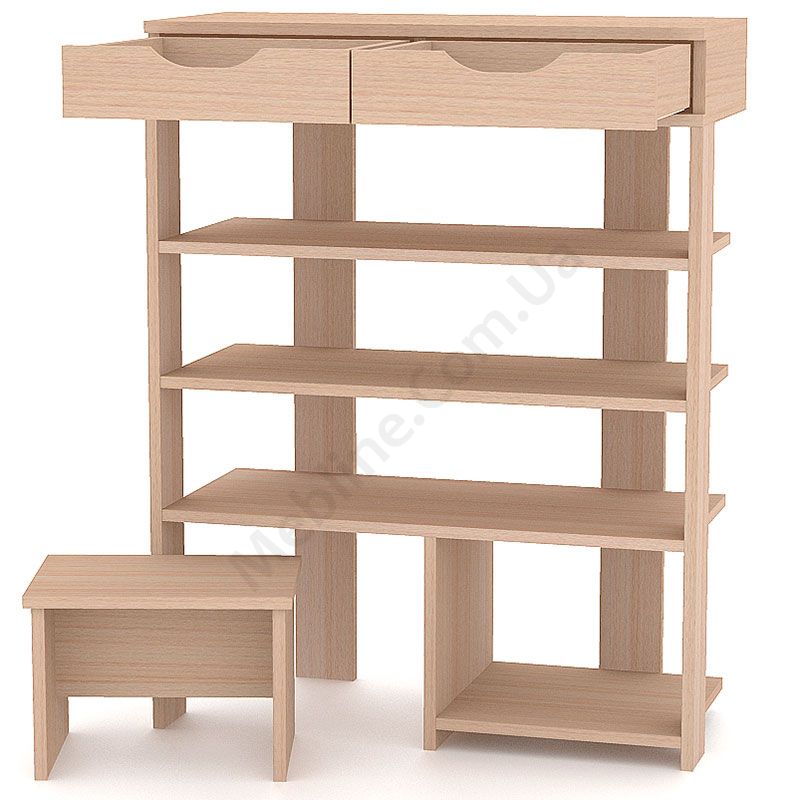 Виконаний з ламінованої ДСП Swiss Krono, завтовшки 16 мм.Екологічна безпека класу Е-1.Кромка — протиударна ПВХ, завтовшки 0,5 мм.Чотири відкриті полиці.Табурет для зручного взування взуття.Дві висувні шухляди.Шухляди без напрямних.