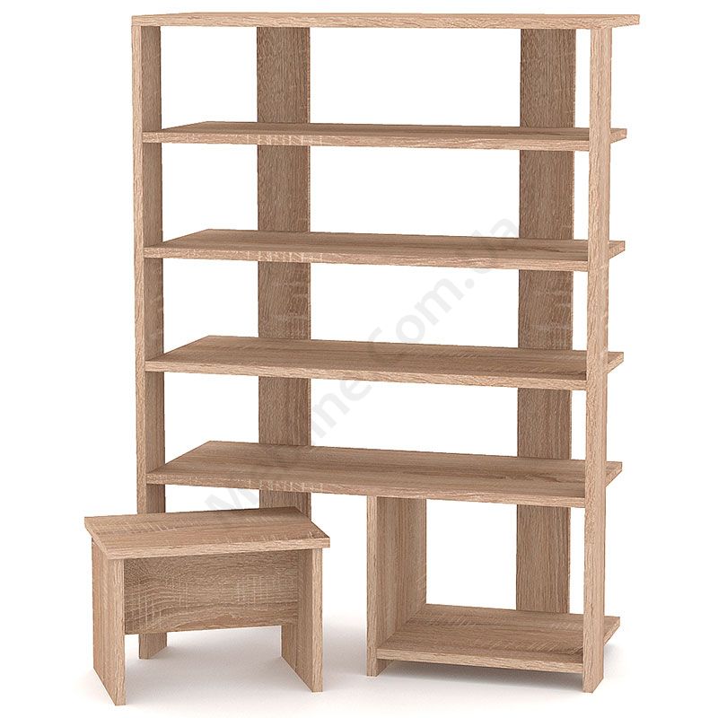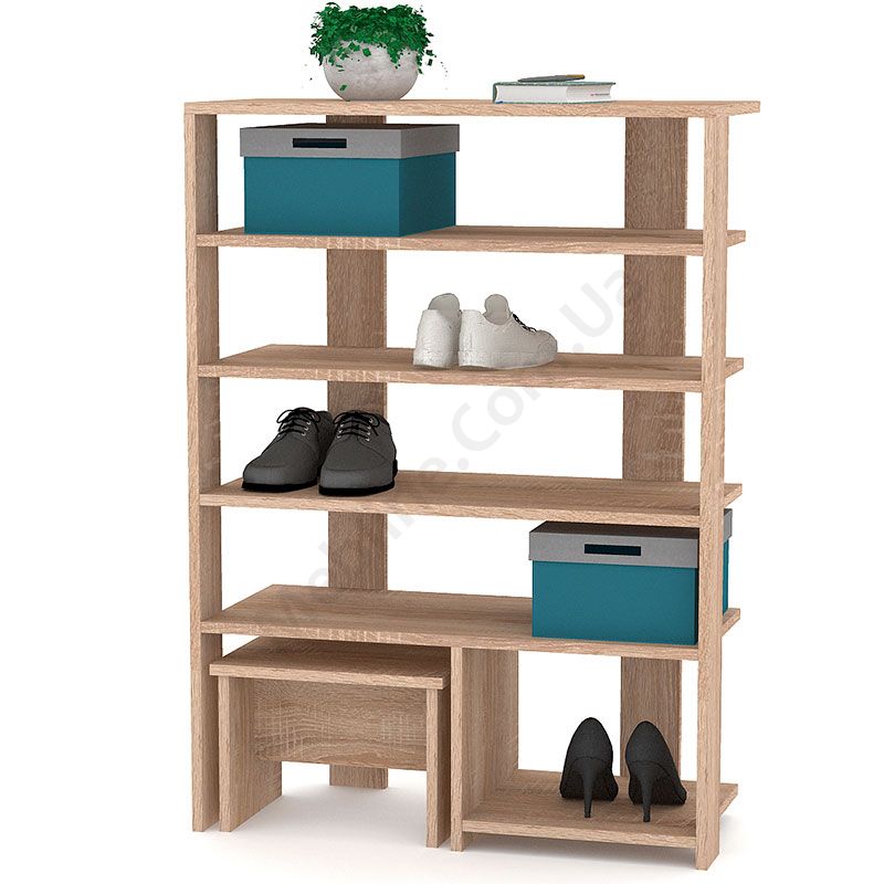 Виконаний з ламінованої ДСП Swiss Krono, завтовшки 16 мм.Екологічна безпека класу Е-1.Кромка — протиударна ПВХ, завтовшки 0,5 мм.П’ять відкритих полиць.Табурет для зручного взування взуття.