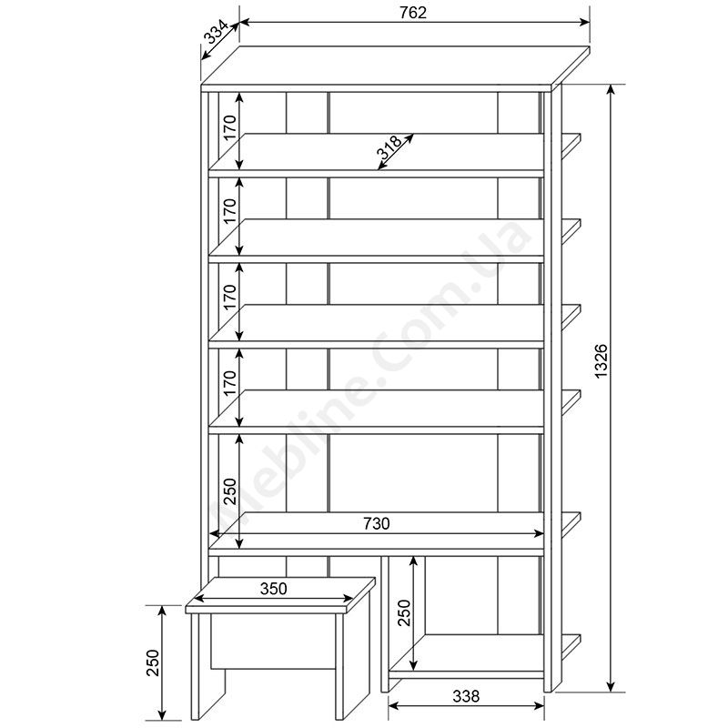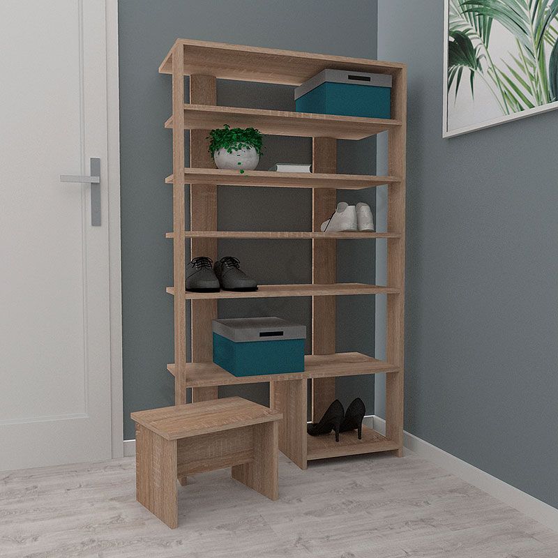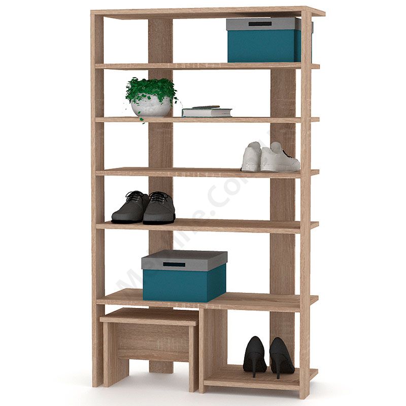 Виконаний з ламінованої ДСП Swiss Krono, завтовшки 16 мм.Екологічна безпека класу Е-1.Кромка — протиударна ПВХ, завтовшки 0,5 мм.Шість відкритих полиць.Табурет для зручного взування взуття.