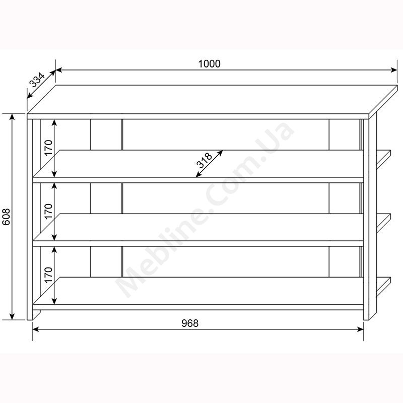 Виконаний з ламінованої ДСП Swiss Krono, завтовшки 16 мм.Екологічна безпека класу Е-1.Кромка — протиударна ПВХ, завтовшки 0,5 мм.Три відкриті полиці.