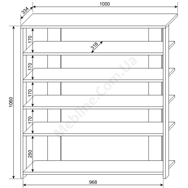 Виконаний з ламінованої ДСП Swiss Krono, завтовшки 16 мм.Екологічна безпека класу Е-1.Кромка — протиударна ПВХ, завтовшки 0,5 мм.П’ять відкритих полиць.