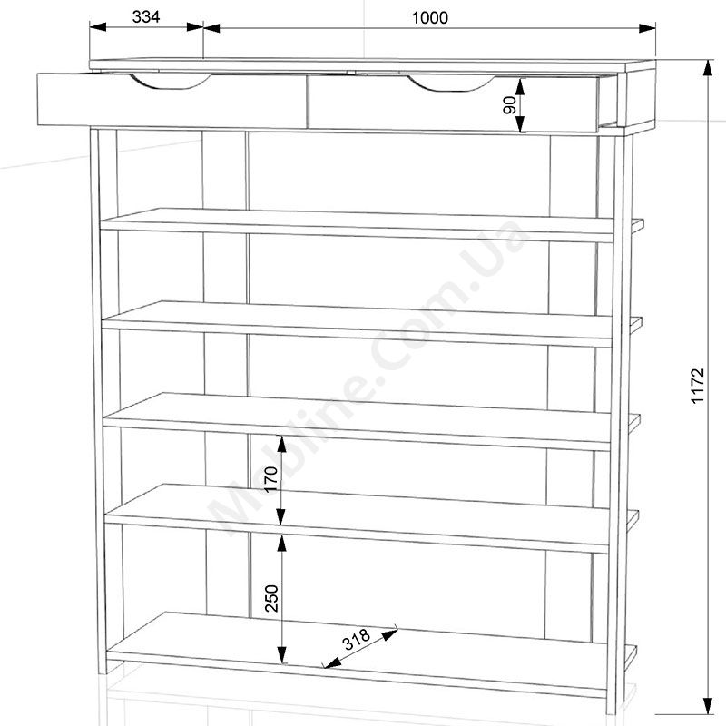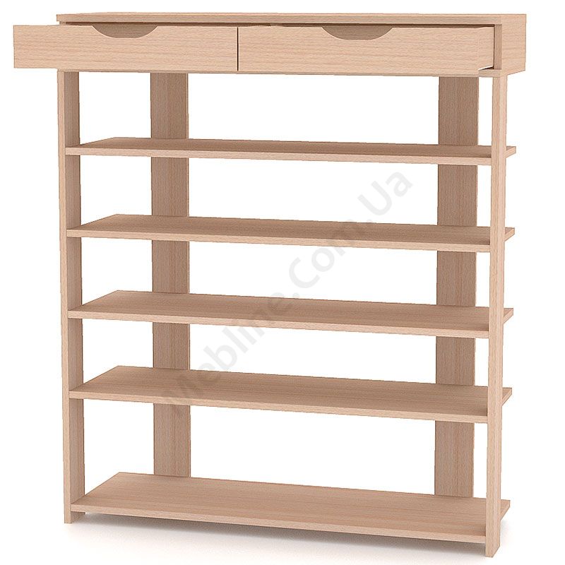 Виконаний з ламінованої ДСП Swiss Krono, завтовшки 16 мм.Екологічна безпека класу Е-1.Кромка — протиударна ПВХ, завтовшки 0,5 мм.П’ять відкритих полиць.Дві висувні шухляди.Шухляди без напрямних.