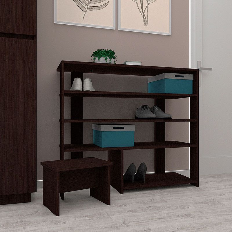 Виконаний з ламінованої ДСП Swiss Krono, завтовшки 16 мм.Екологічна безпека класу Е-1.Кромка — протиударна ПВХ, завтовшки 0,5 мм.Чотири відкриті полиці.Табурет для зручного взування взуття.