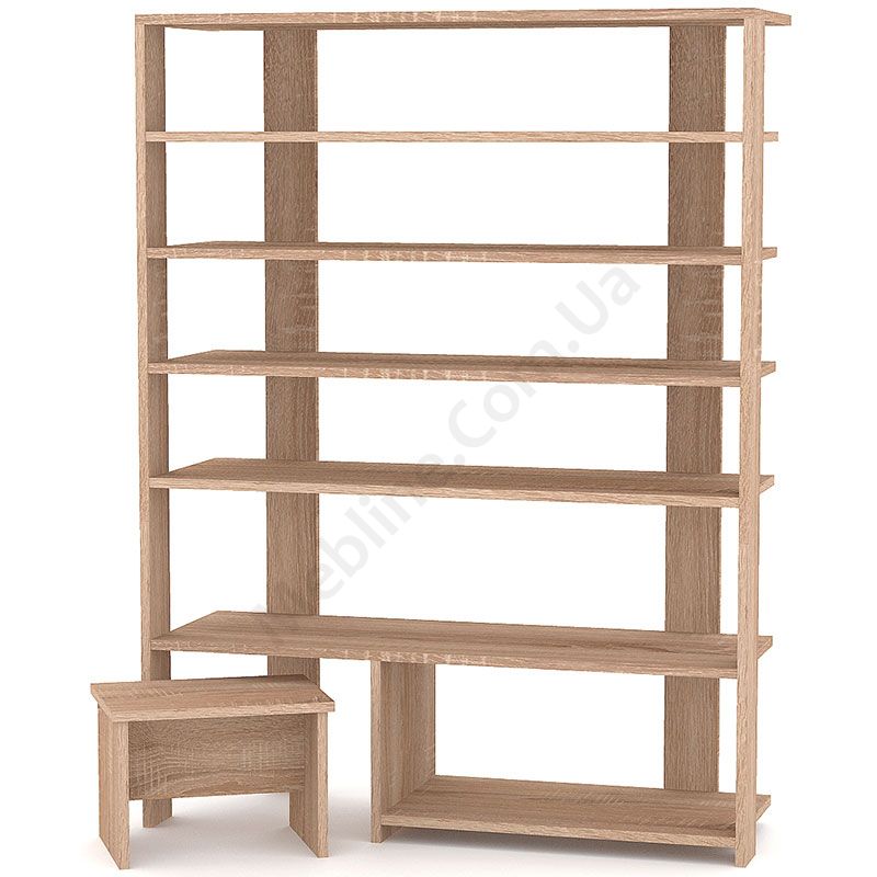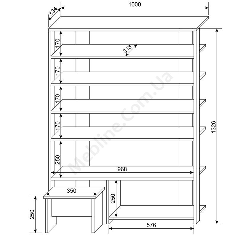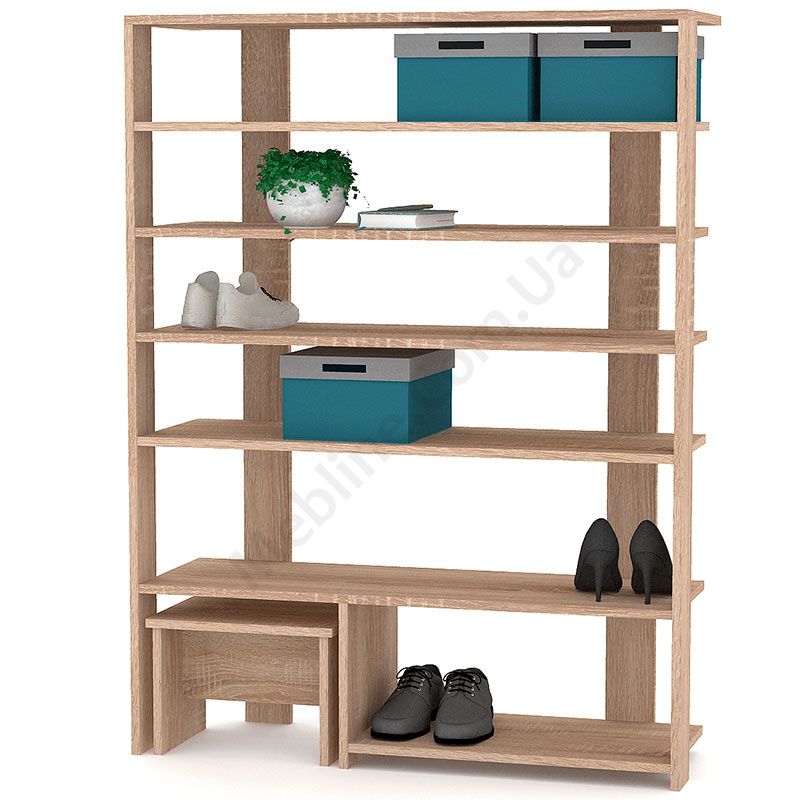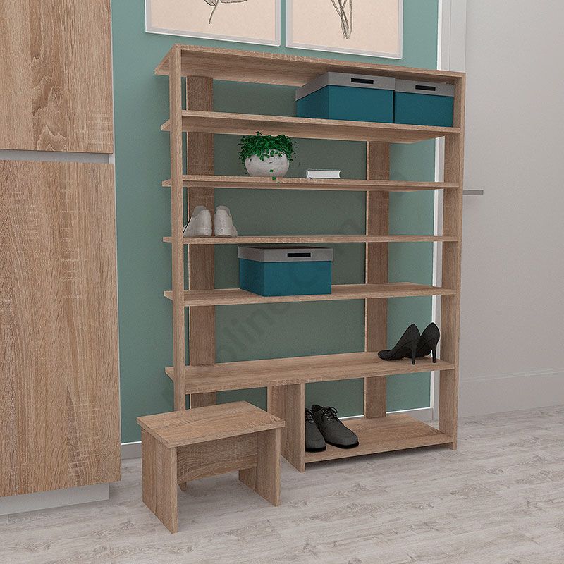 Виконаний з ламінованої ДСП Swiss Krono, завтовшки 16 мм.Екологічна безпека класу Е-1.Кромка — протиударна ПВХ, завтовшки 0,5 мм.Шість відкритих полиць.Табурет для зручного взування взуття.