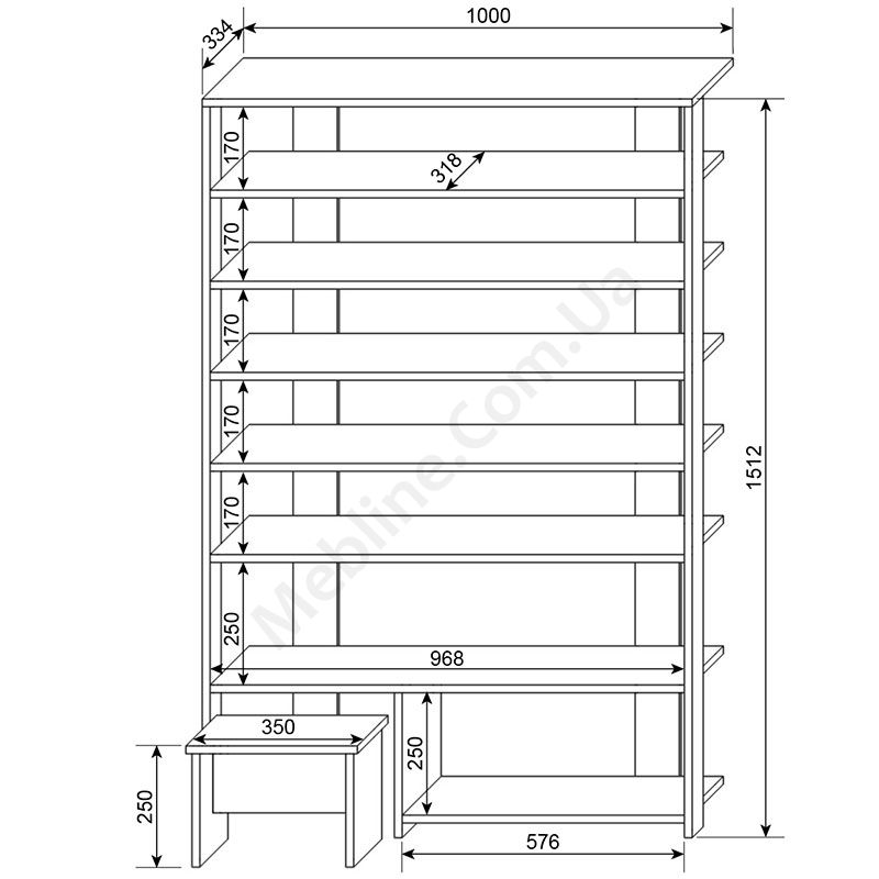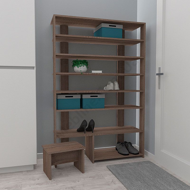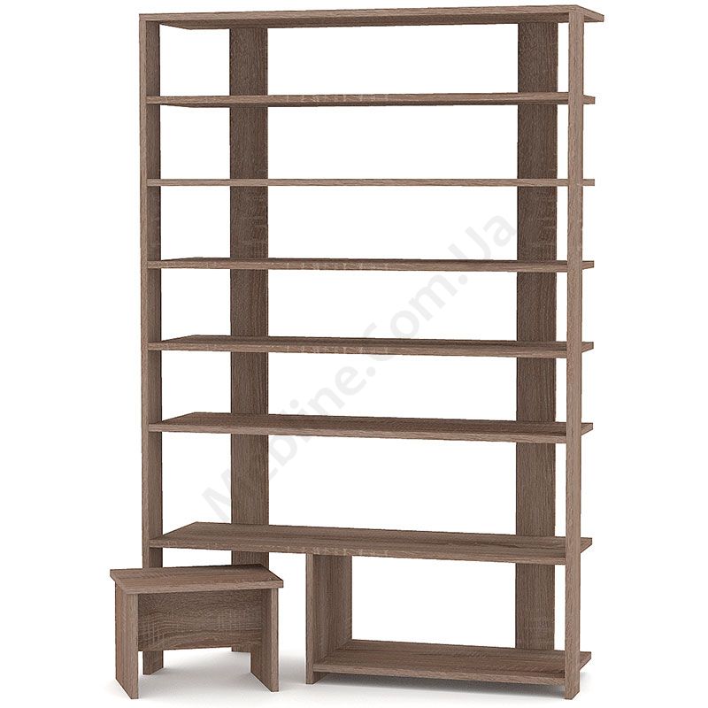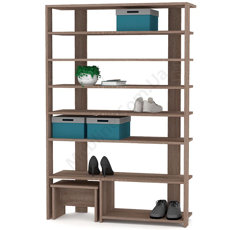 Виконаний з ламінованої ДСП Swiss Krono, завтовшки 16 мм.Екологічна безпека класу Е-1.Кромка — протиударна ПВХ, завтовшки 0,5 мм.Сім відкритих полиць.Табурет для зручного взування взуття.
