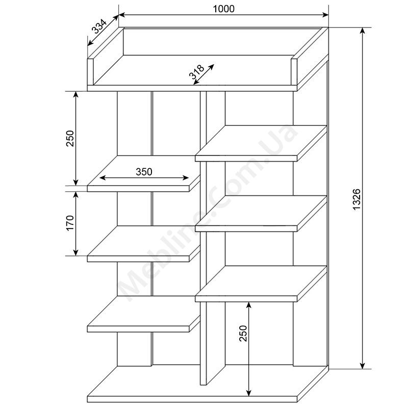 Виконаний з ламінованої ДСП Swiss Krono, завтовшки 16 мм.Екологічна безпека класу Е-1.Кромка — протиударна ПВХ, завтовшки 0,5 мм.Сім відкритих полиць.