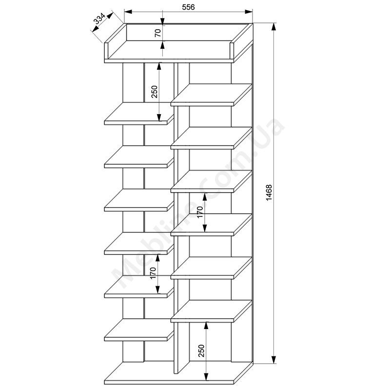 Виконаний з ламінованої ДСП Swiss Krono, завтовшки 16 мм.Екологічна безпека класу Е-1.Кромка — протиударна ПВХ, завтовшки 0,5 мм.Тринадцять відкритих полиць.