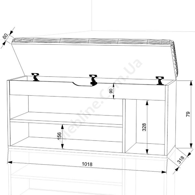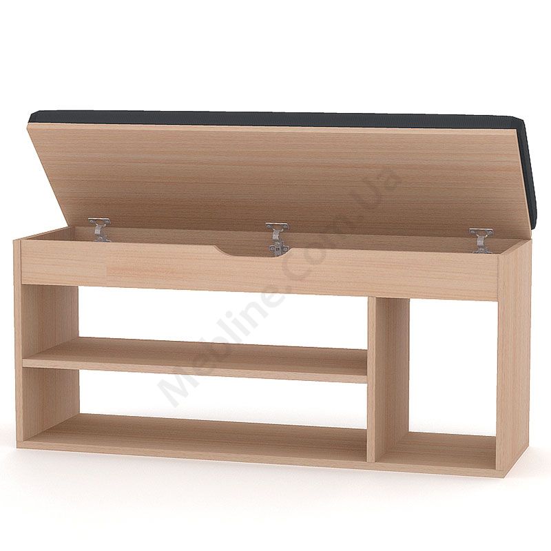 Виконаний з ламінованої ДСП Swiss Krono, завтовшки 16 мм.Екологічна безпека класу Е-1.Кромка — протиударна ПВХ, завтовшки 0,5 мм.Три відкриті секції.Сидіння з м’якою тканинною оббивкою.Під сидінням невеликий короб для зберігання.