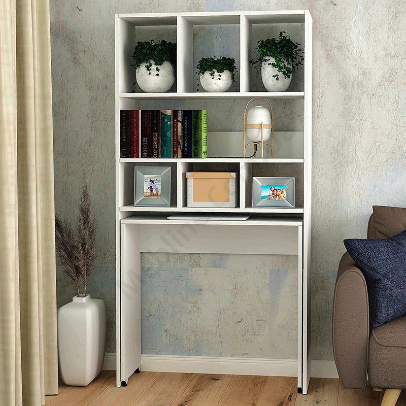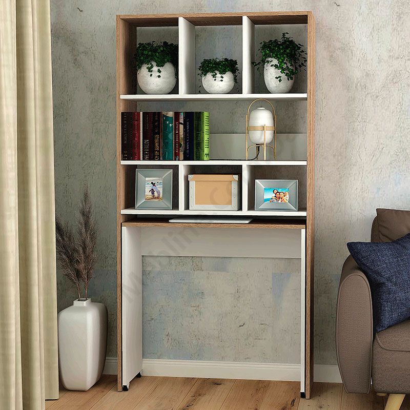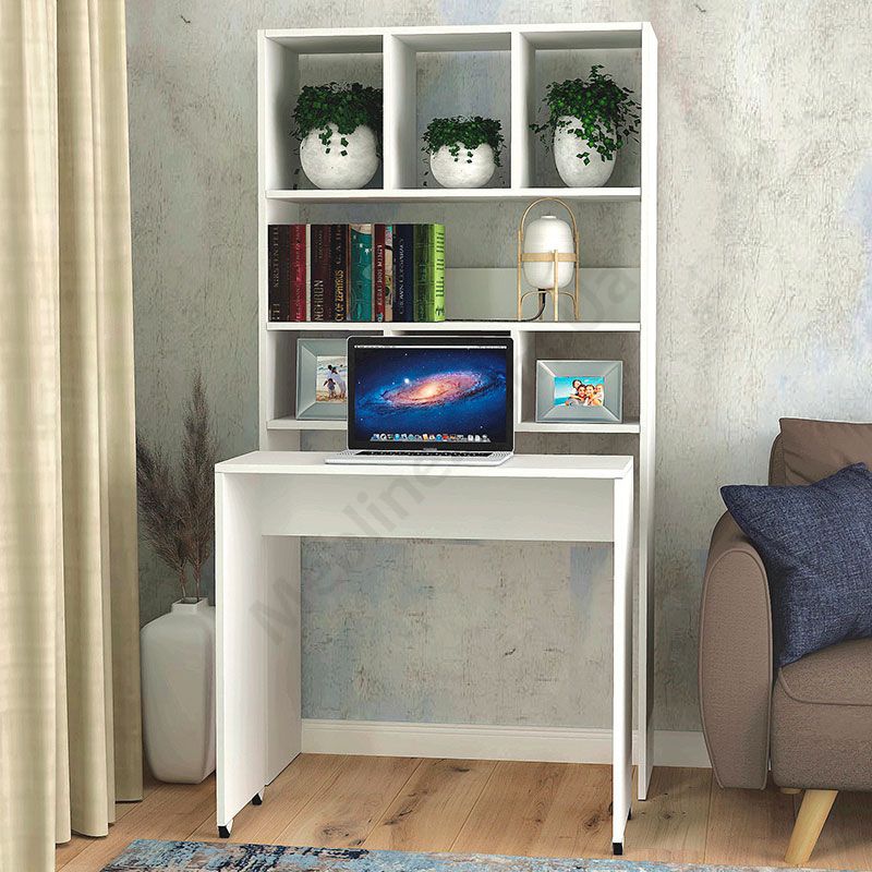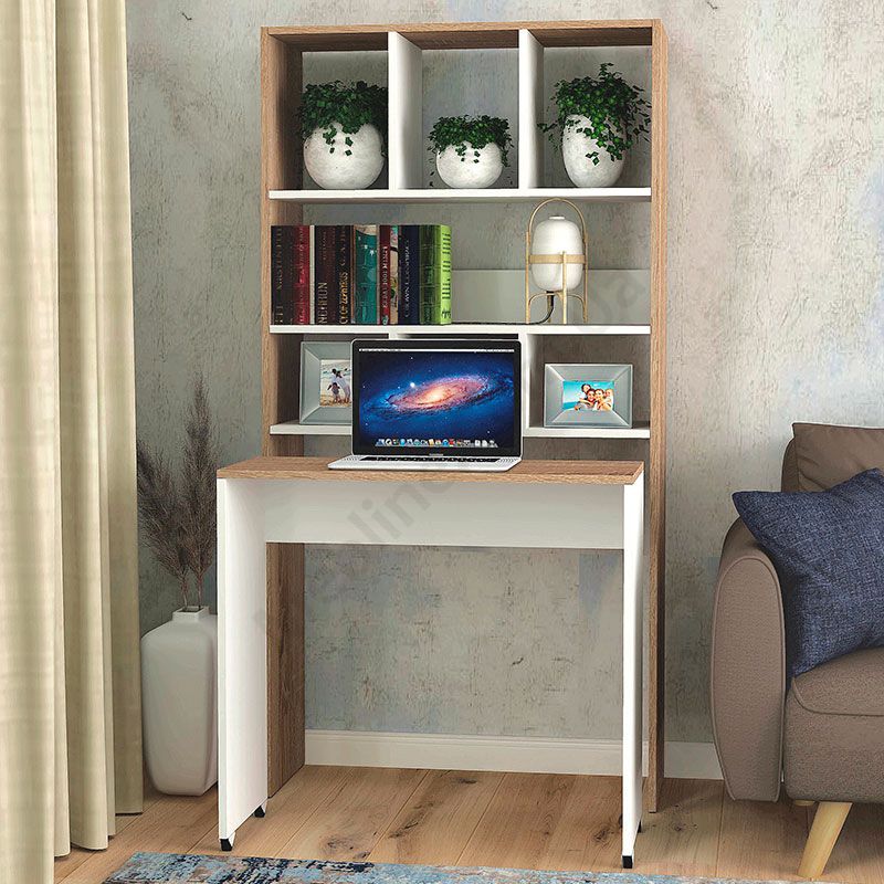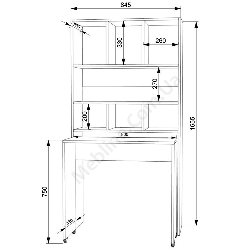 Ламінована ДСП Swiss Krono, завтовшки 16 мм.Екологічна безпека класу Е-1.Фурнітура "DC", "Linken".Протиударна кромка стільниці — ПВХ, завтовшки 1 мм.Протиударна кромка корпусу — ПВХ, завтовшки 0, 5 мм.Стіл висувається з-під стелажа.Стелаж має сім відкритих секцій.