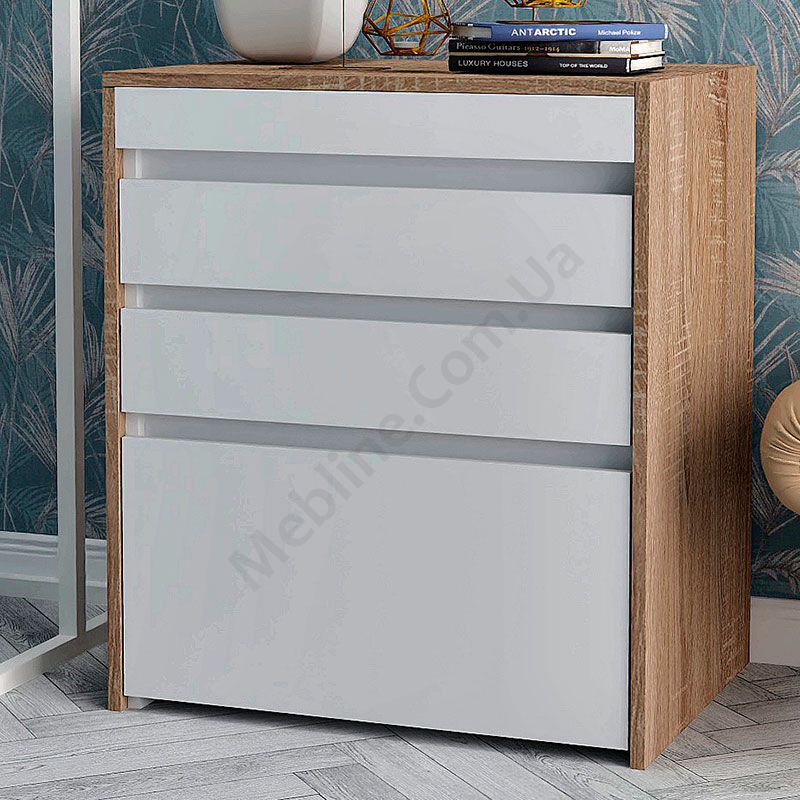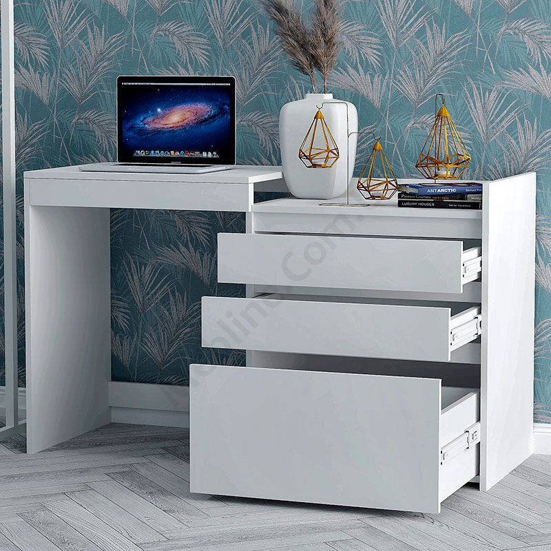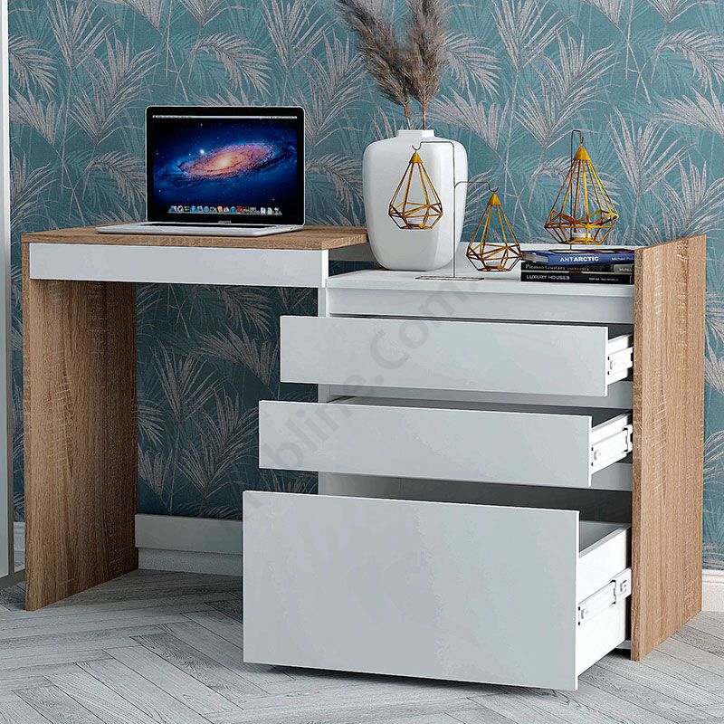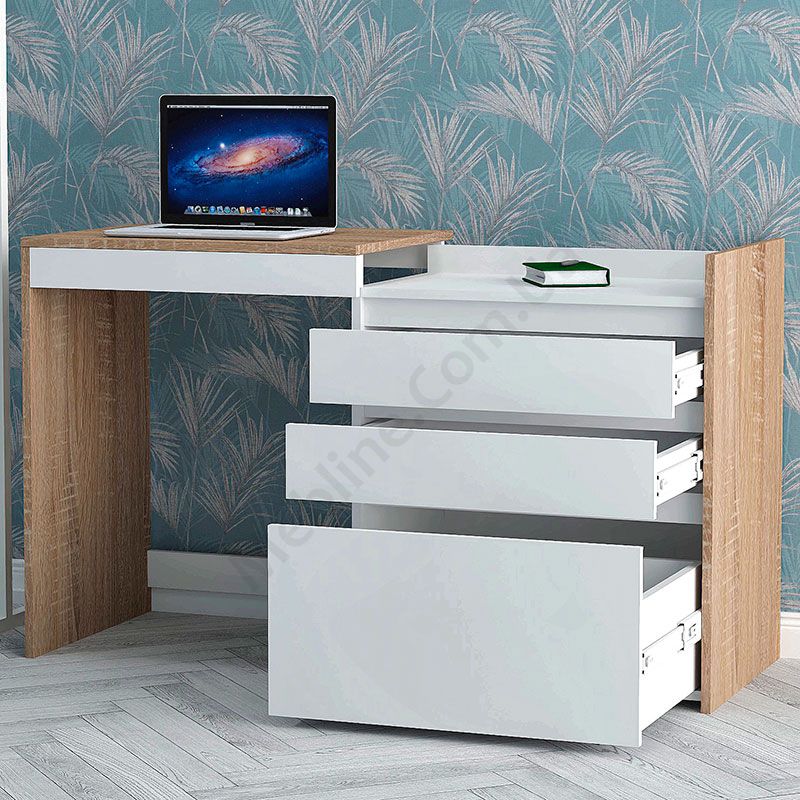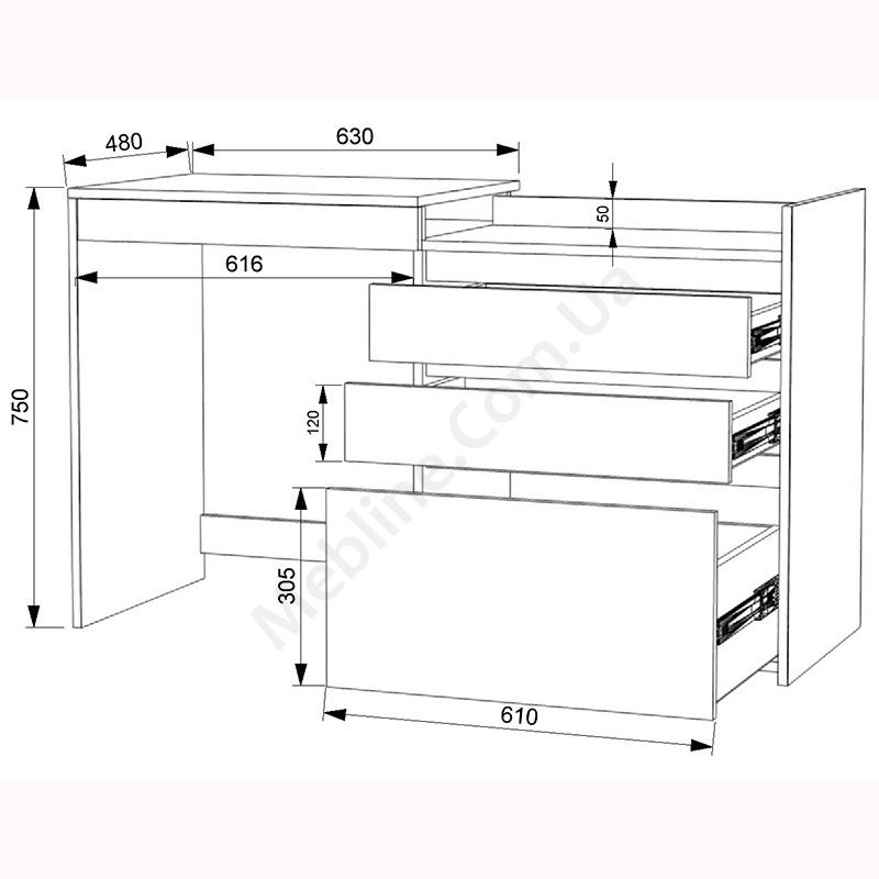Ламінована ДСП Swiss Krono, завтовшки 16 мм.Екологічна безпека класу Е-1.Фурнітура "DC", "Linken".Протиударна кромка стільниці — ПВХ, завтовшки 1 мм.Протиударна кромка корпусу — ПВХ, завтовшки 0, 5 мм.В складеному вигляді має зовнішність комода.Розкладається у прямий комп’ютерний стіл.Має три висувні шухляди.Замість ручок проміжок у фасадах.