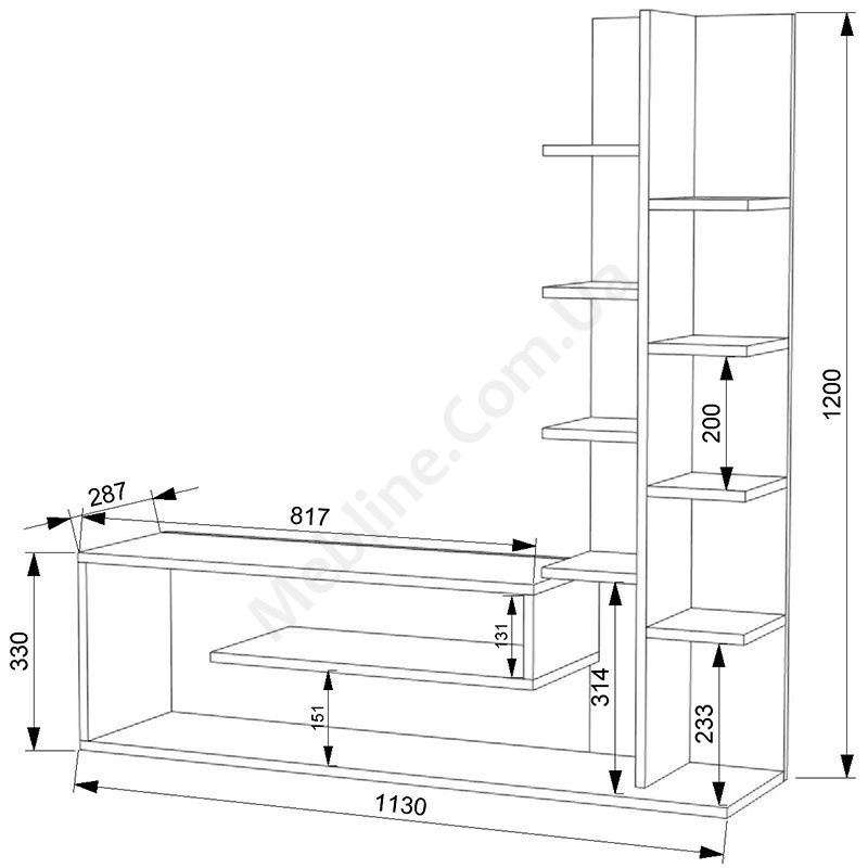 Виконано з ламінованої ДСП, завтовшки 16 мм.Кромка — ПВХ, завтовшки 0, 5 мм.Фурнітура — DC.Відкриті полиці для необхідних речей та декору.