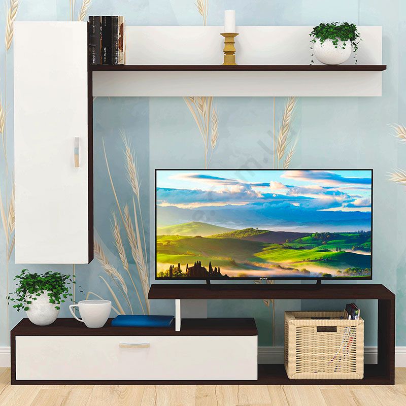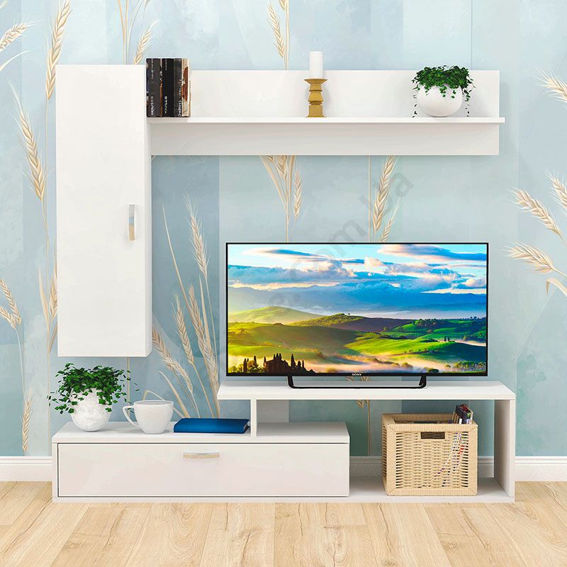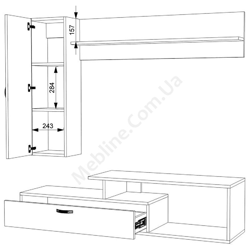 Виконано з ламінованої ДСП, завтовшки 16 мм.Кромка — ПВХ, завтовшки 0, 5 мм.Фурнітура — DC.Тумба під телевізор з висувною шухлядою та відкритою секцією.За дверцятами шафки дві полиці.Навісна полиця з пристінним бортом.
