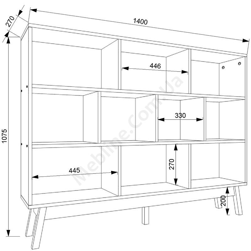 Виконаний з ламінованої ДСП Swiss Krono, завтовшки 16 мм.Екологічна безпека класу Е-1.Ніжки — натуральне дерево.Кромка — протиударна ПВХ, завтовшки 0,5 мм.Десять відкритих секцій.