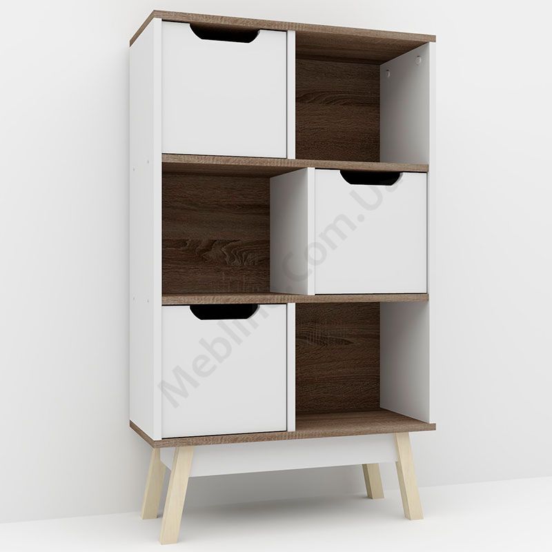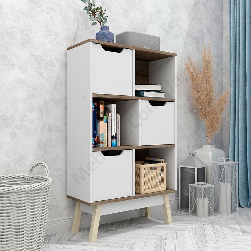 Сталаж на ніжках з відкритими полицями та дверцятами.