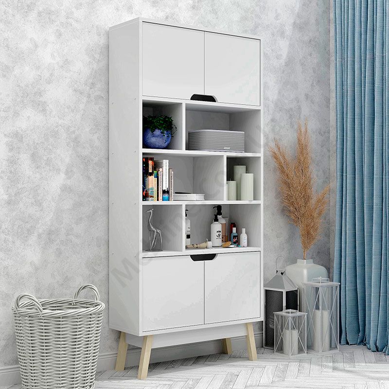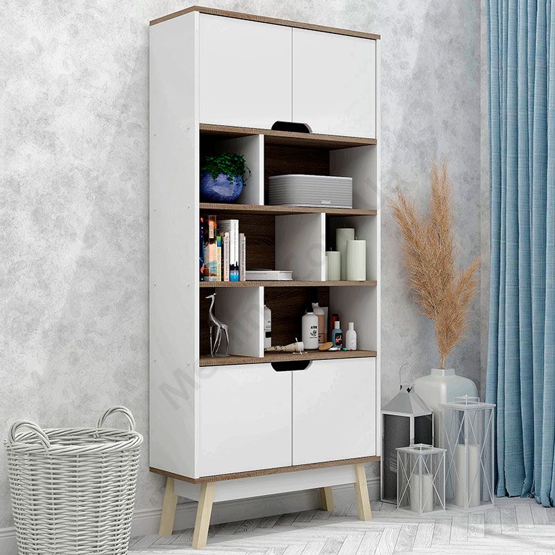 Сталаж на ніжках з відкритими полицями та дверцятами.