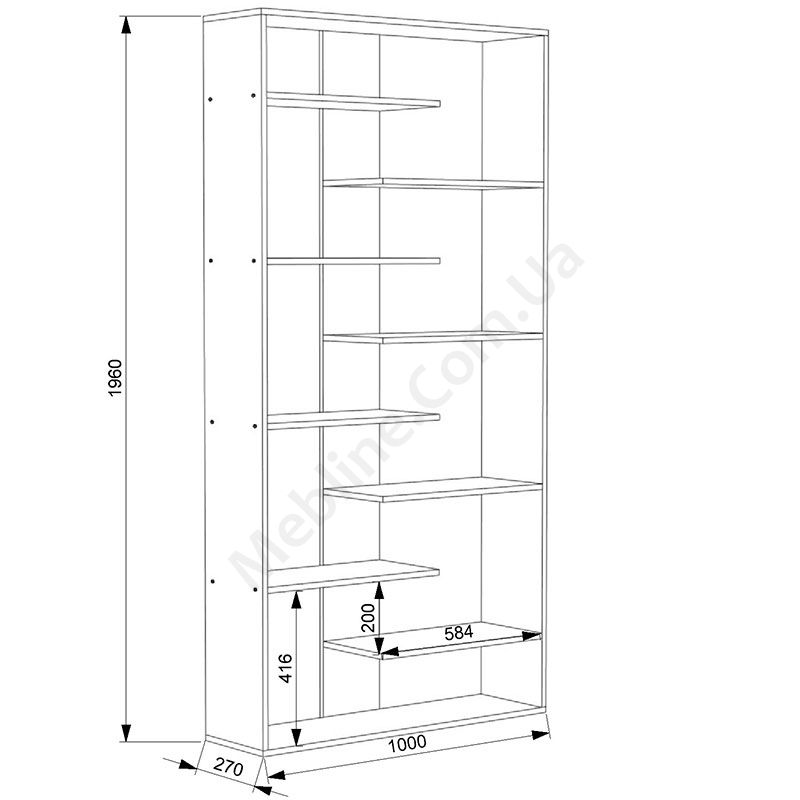 Виконаний з ламінованої ДСП Swiss Krono, завтовшки 16 мм.Екологічна безпека класу Е-1.Кромка — протиударна ПВХ, завтовшки 0,5 мм.Вісім відкритих поличок.
