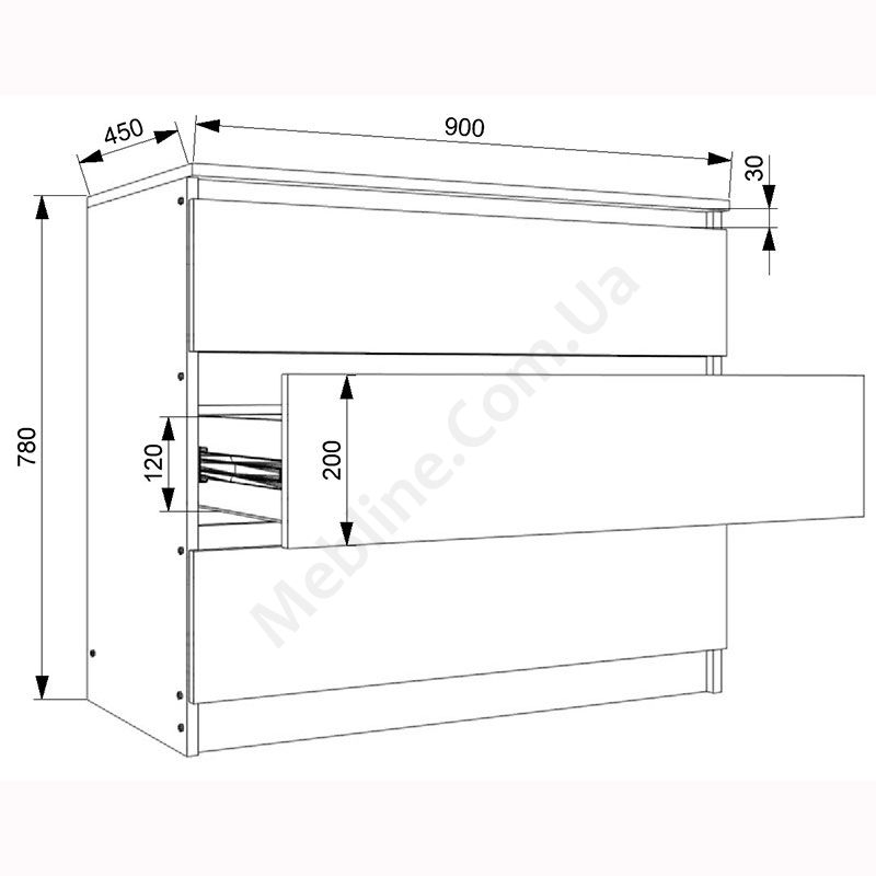 Виконаний з ламінованої ДСП Swiss Krono, завтовшки 16 мм.ДСП має високу щільність.Екологічна безпека класу Е-1.Кромка — протиударна ПВХ, завтовшки 0, 5 мм.Фурнітура — DC та Linken.Три висувні шухляди.Шухляди на телескопічних напрямних, глибиною 400 мм.