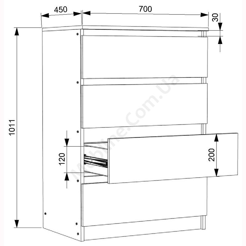 Виконаний з ламінованої ДСП Swiss Krono, завтовшки 16 мм.ДСП має високу щільність.Екологічна безпека класу Е-1.Кромка — протиударна ПВХ, завтовшки 0, 5 мм.Фурнітура — DC та Linken.Чотири висувні шухляди.Шухляди на телескопічних напрямних, глибиною 400 мм.
