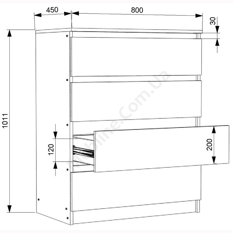Виконаний з ламінованої ДСП Swiss Krono, завтовшки 16 мм.ДСП має високу щільність.Екологічна безпека класу Е-1.Кромка — протиударна ПВХ, завтовшки 0, 5 мм.Фурнітура — DC та Linken.Чотири висувні шухляди.Шухляди на телескопічних напрямних, глибиною 400 мм.