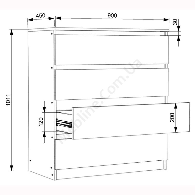 Виконаний з ламінованої ДСП Swiss Krono, завтовшки 16 мм.ДСП має високу щільність.Екологічна безпека класу Е-1.Кромка — протиударна ПВХ, завтовшки 0, 5 мм.Фурнітура — DC та Linken.Чотири висувні шухляди.Шухляди на телескопічних напрямних, глибиною 400 мм.