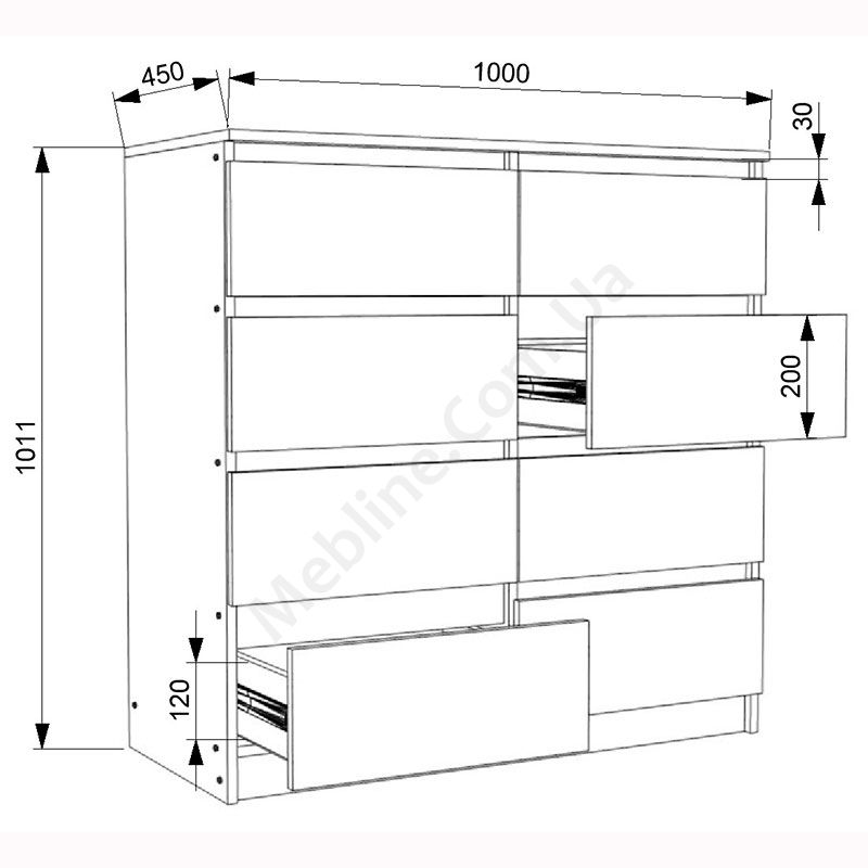 Виконаний з ламінованої ДСП Swiss Krono, завтовшки 16 мм.ДСП має високу щільність.Екологічна безпека класу Е-1.Кромка — протиударна ПВХ, завтовшки 0, 5 мм.Фурнітура — DC та Linken.Вісім висувних шухляд.Шухляди на телескопічних напрямних, глибиною 400 мм.