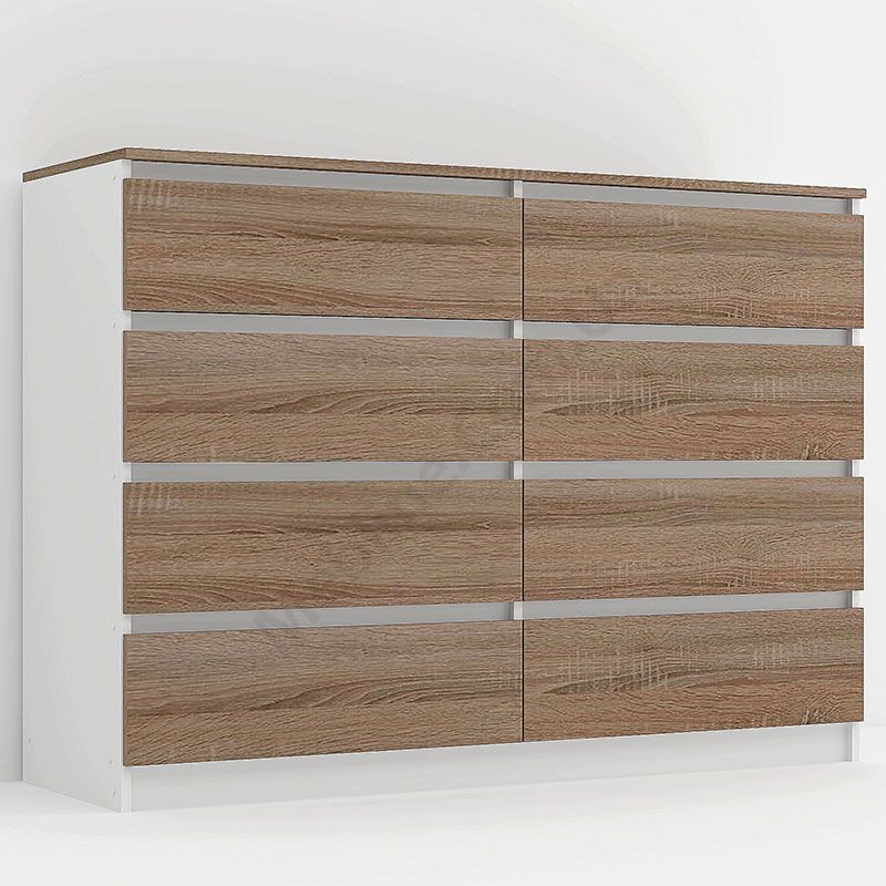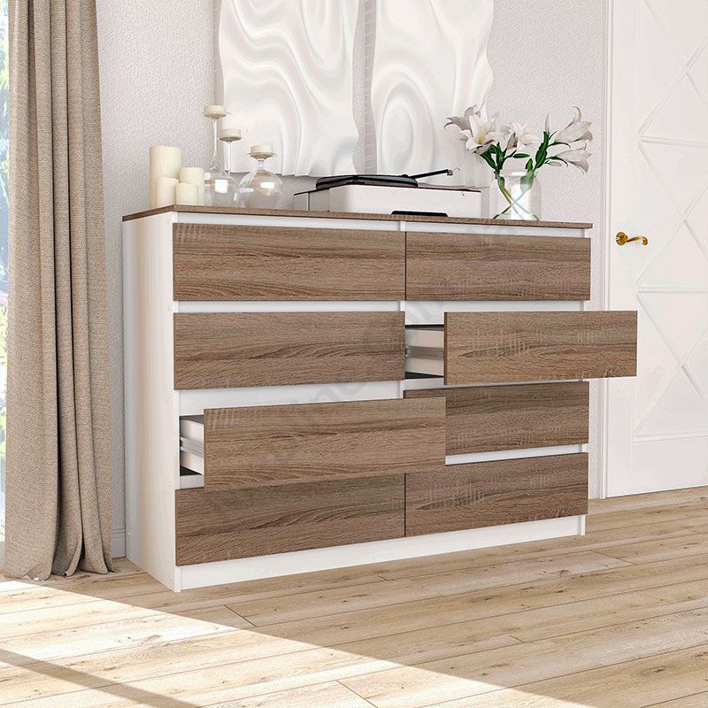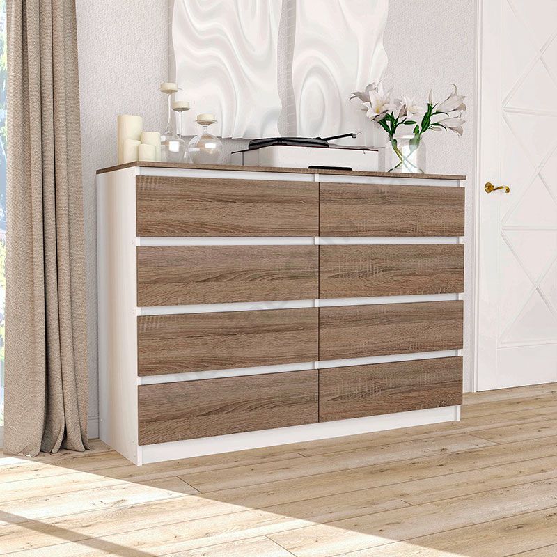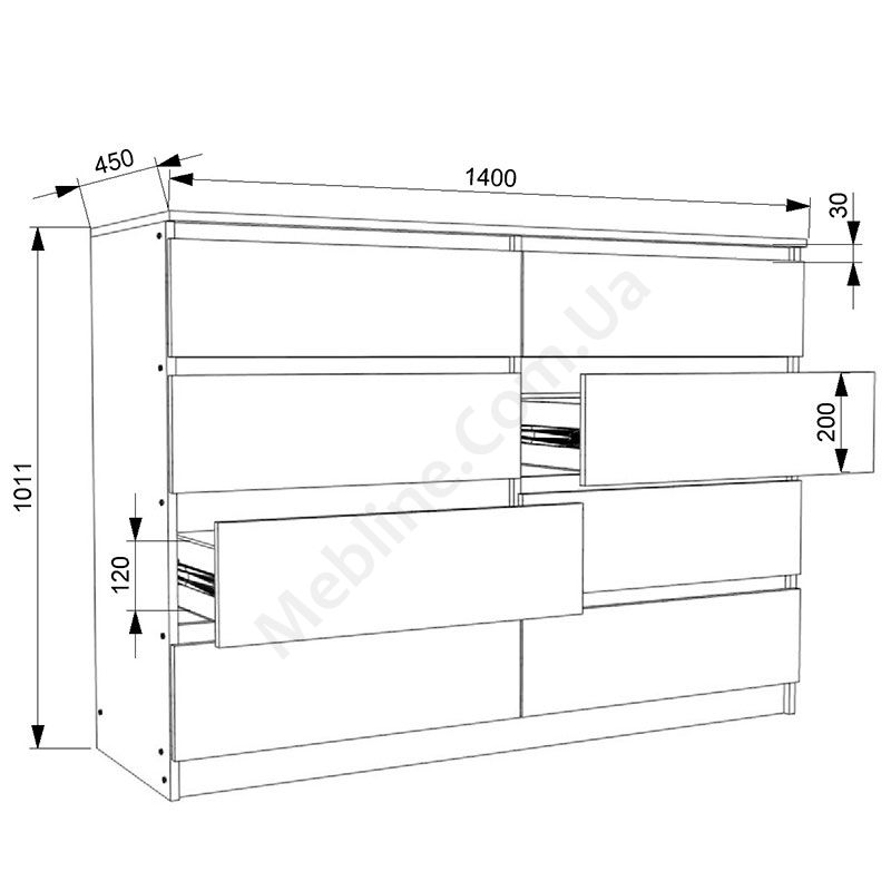 Виконаний з ламінованої ДСП Swiss Krono, завтовшки 16 мм.ДСП має високу щільність.Екологічна безпека класу Е-1.Кромка — протиударна ПВХ, завтовшки 0, 5 мм.Фурнітура — DC та Linken.Вісім висувних шухляд.Шухляди на телескопічних напрямних, глибиною 400 мм.