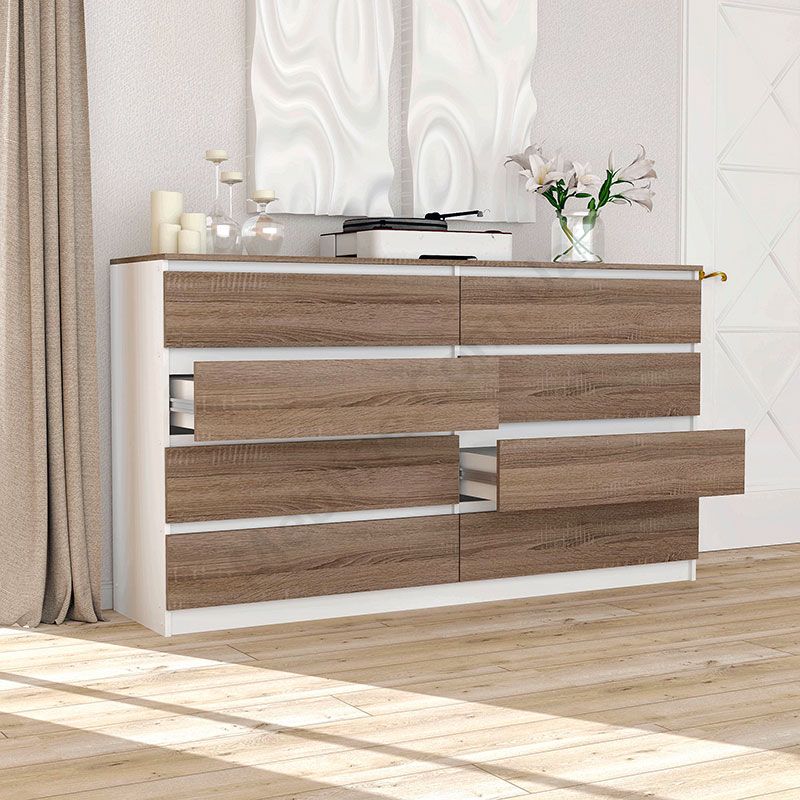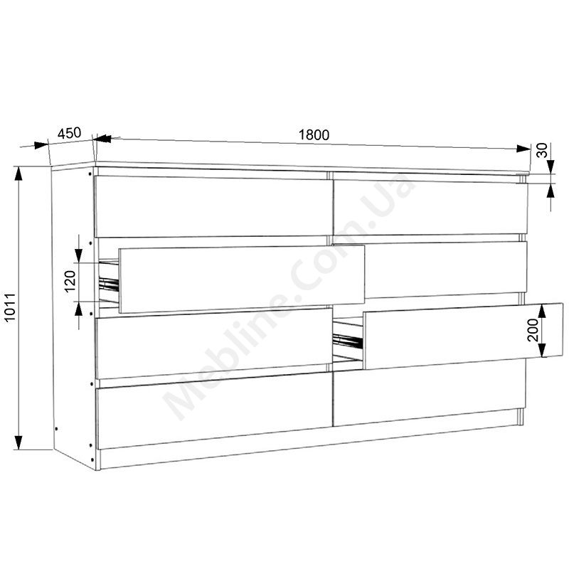 Виконаний з ламінованої ДСП Swiss Krono, завтовшки 16 мм.ДСП має високу щільність.Екологічна безпека класу Е-1.Кромка — протиударна ПВХ, завтовшки 0, 5 мм.Фурнітура — DC та Linken.Вісім висувних шухляд.Шухляди на телескопічних напрямних, глибиною 400 мм.