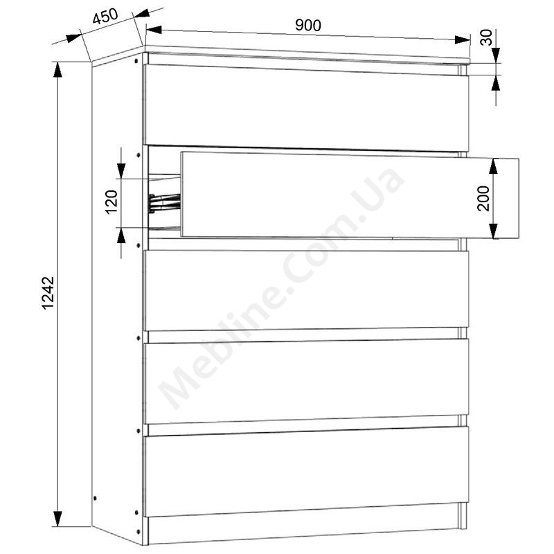 Виконаний з ламінованої ДСП Swiss Krono, завтовшки 16 мм.ДСП має високу щільність.Екологічна безпека класу Е-1.Кромка — протиударна ПВХ, завтовшки 0, 5 мм.Фурнітура — DC та Linken.П’ять висувних шухляд.Шухляди на телескопічних напрямних, глибиною 400 мм.