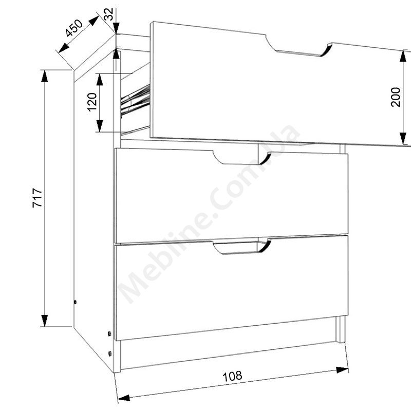 Виконаний з ламінованої ДСП Swiss Krono, завтовшки 16 мм.ДСП має високу щільність.Екологічна безпека класу Е-1.Кромка — протиударна ПВХ, завтовшки 0, 5 мм.Фурнітура — DC та Linken.Три висувні шухляди.Шухляди на телескопічних напрямних, глибиною 400 мм.Замість ручок вирізи у фасадах.