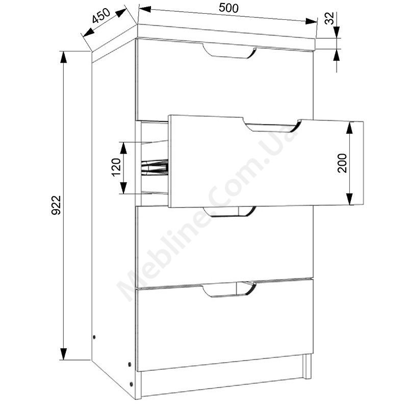 Виконаний з ламінованої ДСП Swiss Krono, завтовшки 16 мм.ДСП має високу щільність.Екологічна безпека класу Е-1.Кромка — протиударна ПВХ, завтовшки 0, 5 мм.Фурнітура — DC та Linken.Чотири висувні шухляди.Шухляди на телескопічних напрямних, глибиною 400 мм.Замість ручок вирізи у фасадах.